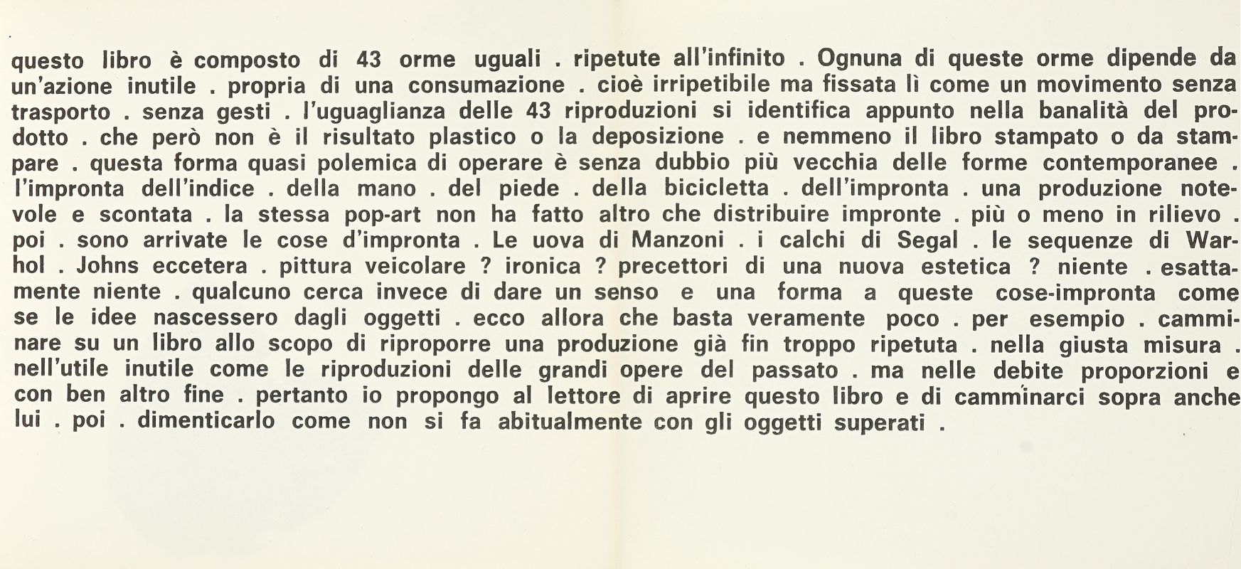 In-8° (245x170). Pagine 16, [2]. Con una tavola a colori a doppia pagina, fuori testo. Ultimo fascicolo staccato, ma ben conservato. Esemplare senza numerazione, su una tiratura complessiva di 500 copie. Brossura editoriale con titoli in rosso e nero al piatto. Minimi segni di usura. SI AGGIUNGE: Id., Alfabeto. Milano: L'uomo e l'arte editore, 1974. In-4° (mm 295x208). Uno strappetto restaurabile al piatto anteriore; dorso leggermente staccato, altrimenti ottima copia. SI AGGIUNGE: Id., Impronte n. 43. Testo di Vincenzo Agnetti. Torino: Edizioni Geiger, 1968. In-8° (mm 173x200). 1 frontespizio, 1 carta di testo ripiegata, 1 di colophon e 17 tavole stampate in nero. Brossura editoriale illustrata, con il numero 43 impresso in nero su fondo bianco. Una macchia al piatto anteriore, altrimenti buona copia. Tiratura in 350 copie numerate. SI AGGIUNGE: Id., Eraclito. Tau/ma 1, 1973. Piatto anteriore della brossura parzialmente staccato, ma nel complesso buon esemplare. Una delle 500 copie non numerate, su un totale di 600. SI AGGIUNGE: Claudio Parmiggiani. Reggio Emilia: Pari editori & Dispari, s.d. [i.e. 1970 ca.].
