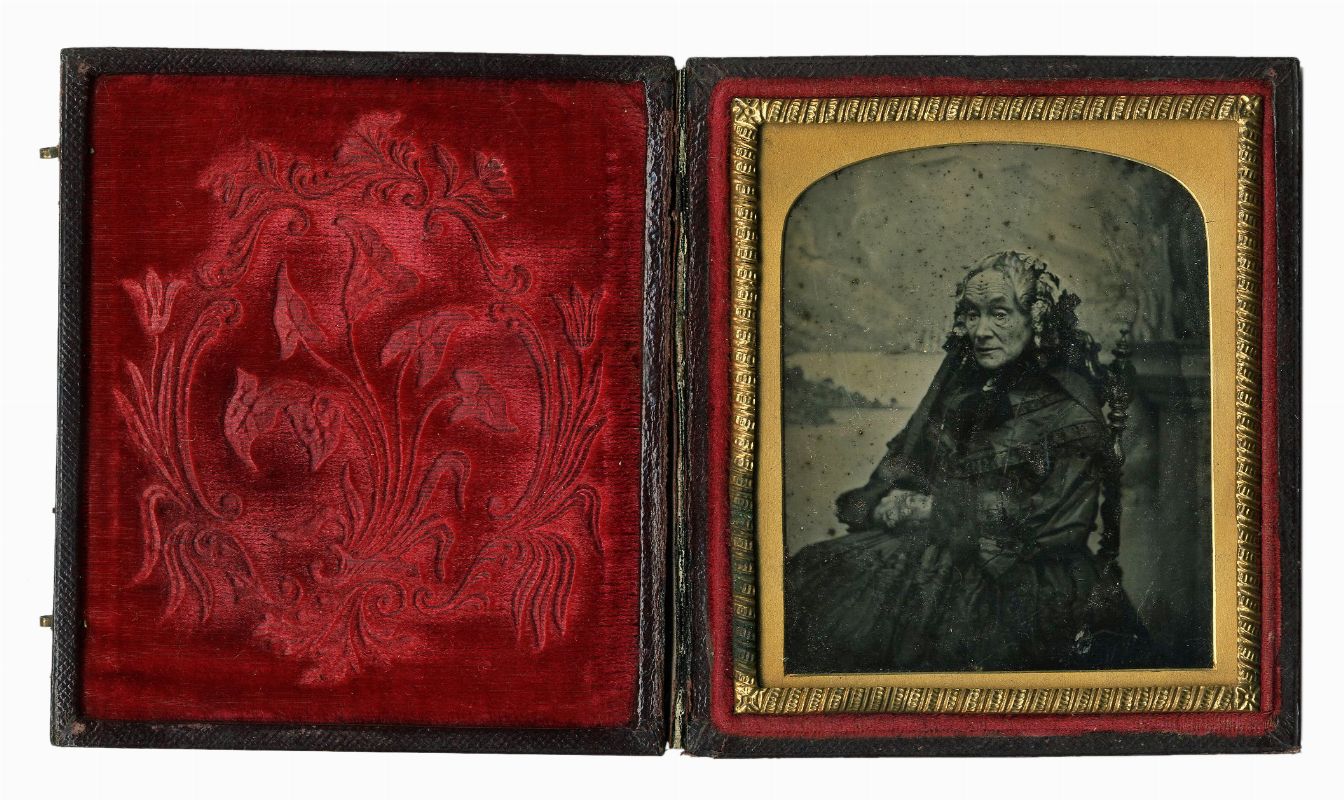 Ambrotipo in cornice dorata con cofanetto originale in pelle e fermagli conservati. All’interno velluto rosso protettivo con impressioni floreali. Dimensioni: 93x83 mm.