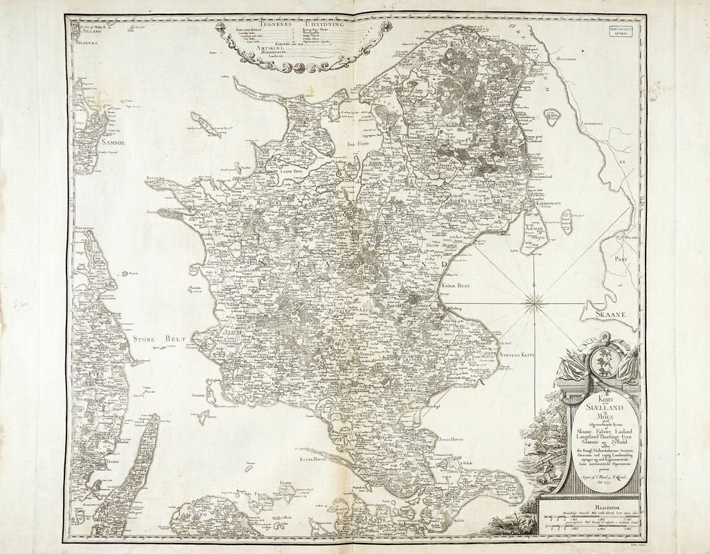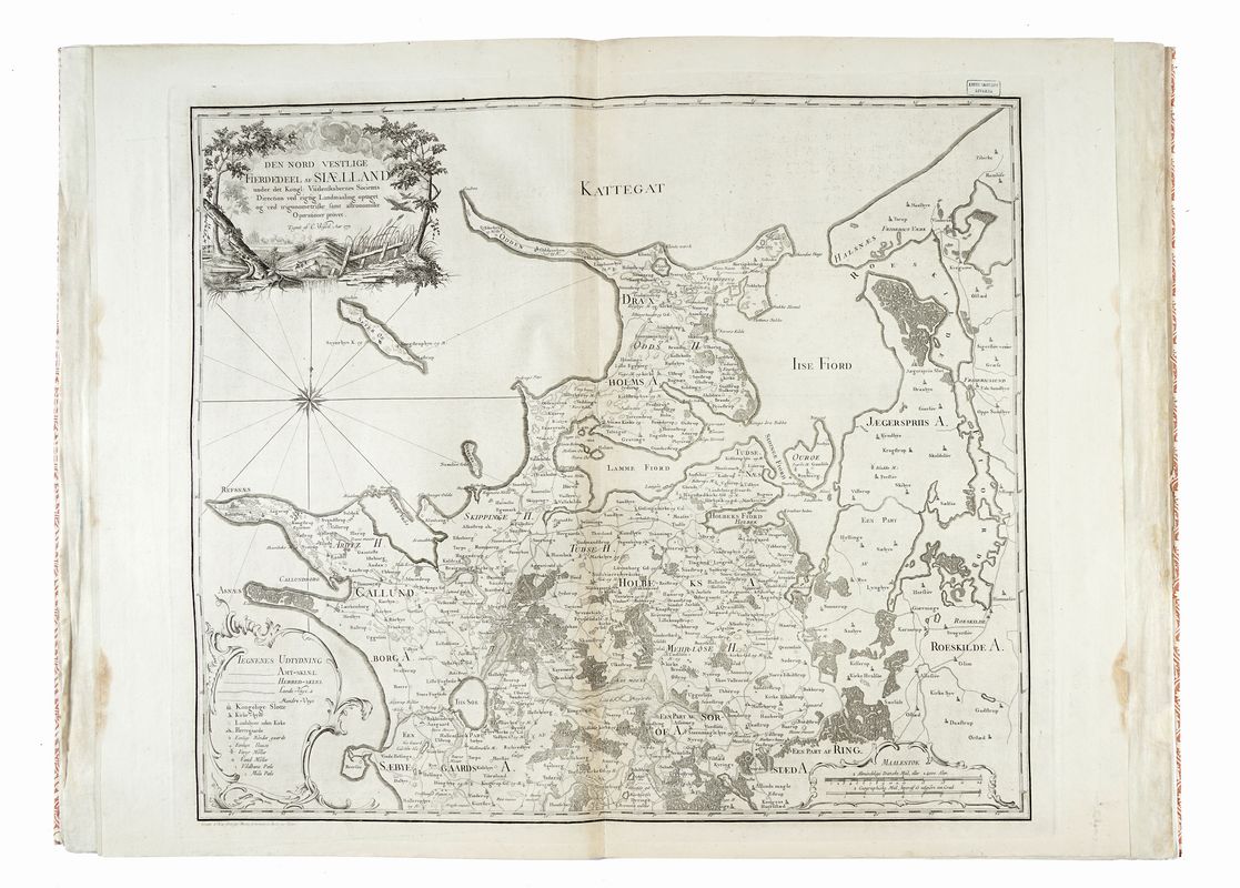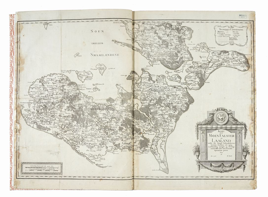 In-folio massimo (mm 643x450). Raccolta di 8 carte geografiche della Danimarca. 1) Kort over Moen Falster og Laaland; 2) Den Syd Ostlige Fierdedeel af Siaelland...; 3) Kort over Haureballegaards... Skanderborg... Silkeborg; 4) Den Sydvestlige Fierdedeel af Siaelland...; 5) Kort over Siaelland og Moen...; 6) Den Nord Vestigle frerdedeel Fierdedeel af Siaelland...; 7) Kort over Den Sydlige Deel af Fyen...; 8) KIøbenhavns Amt Efter Kongelig...Tutte le carte sono ripiegate e a doppia pagina e presentano alcuni difetti: restauri marginali con piccole perdite di inciso a 4 carte della raccolta, alcune macchie marginali. Legatura ottocentesca in mezza tela lisa con piatti ricoperti in carta marmorizzata moderna. Ex-libris di antica appartenenza applicato al contropiatto anteriore.