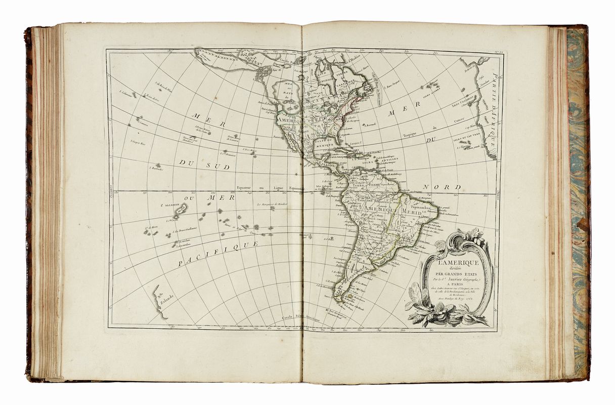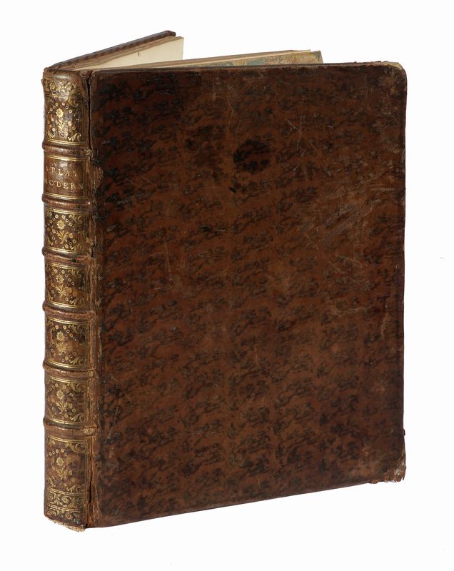 In-folio (mm 390x300). Carte [3] (frontespizio figurato, Avertissement e Indice delle tavole, il tutto inciso in rame), 1 tavola a doppia pagina non numerata raffigurante la Sfera armillare e 35 carte geografiche calcografiche a doppia pagina numerate 1-36 (omessa nella numerazione la numero 25, che non compare nell'indice e non fu mai stampata), carta incisa di Catalogo in fine. Confini delle mappe colorati a mano. Alcune carte lievemente brunite, errori di numerazione - senza perdite - per il resto ottima copia. Legatura coeva in piena pelle coeva con titoli e decorazioni in oro ai comparti del dorso. Sguardie in carta marmorizzata. Mancanze lungo le unghiature e le cerniere. Ex-libris di precedente proprietario al contropiatto anteriore.