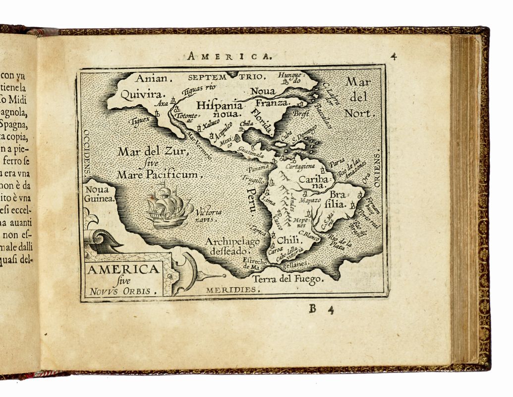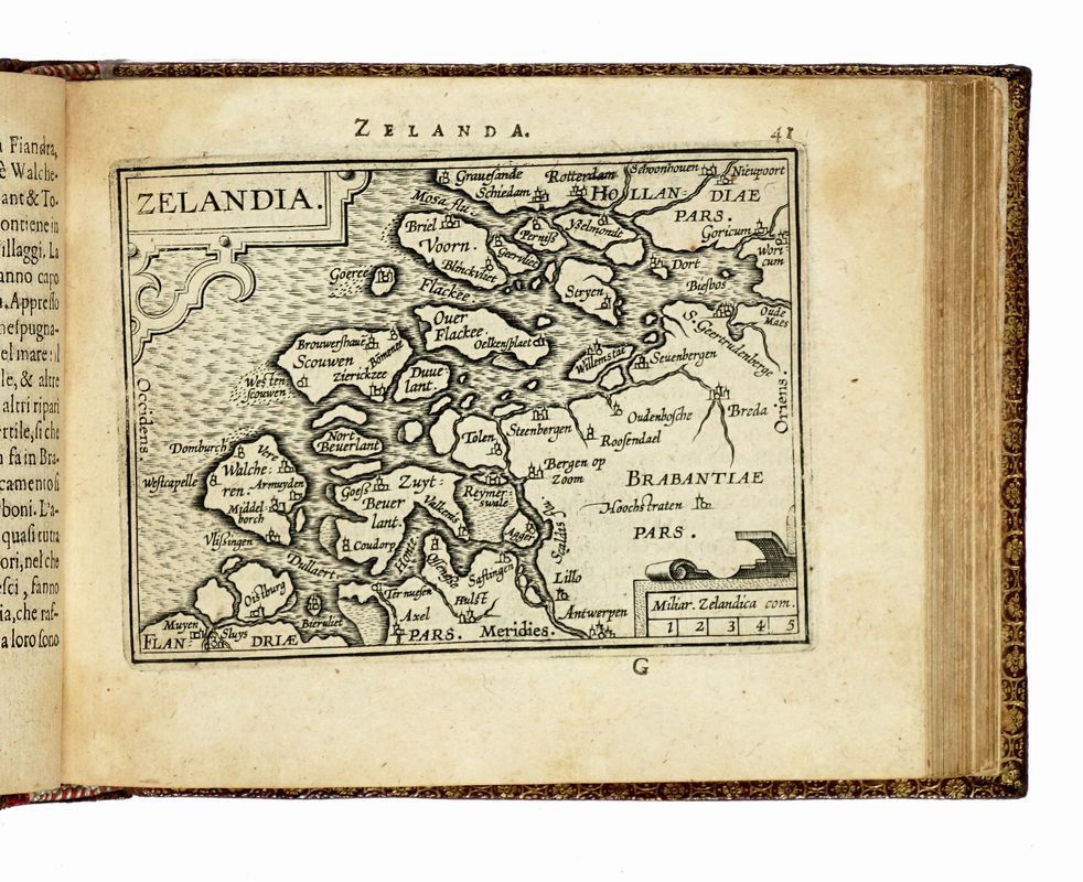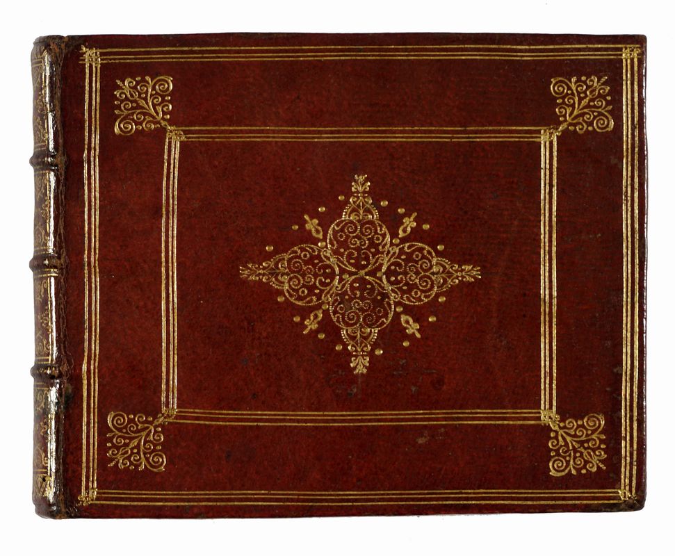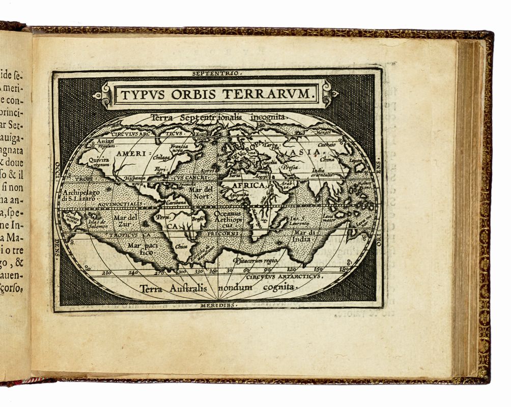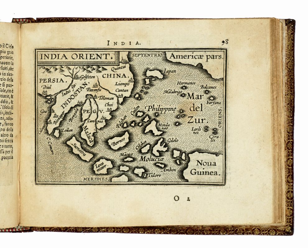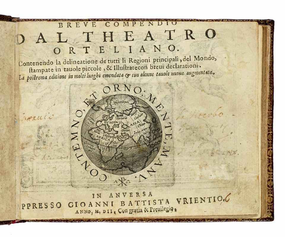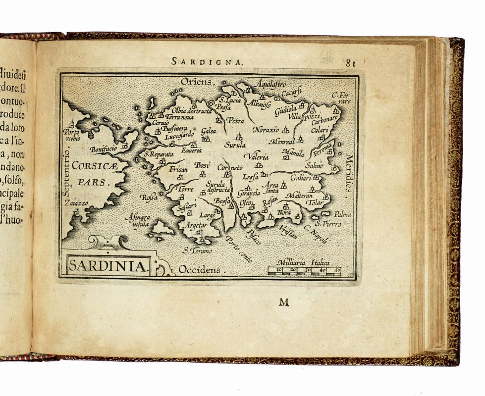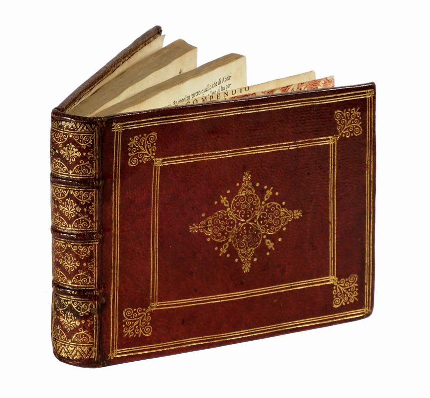 In-8° oblungo (mm 110x140). Carte [4] con frontespizio inciso e dedica con stemma in calcografia al verso della prima carta + 4 tavole non numerate, 106 tavole numerate, [3] tavole di Index, 3 carte bianche. SEGUE: Id., L'additamento dal compendio del theatro minore. Carte [1], 12 tavole numerate, 1 carta di Index. Con, nel complesso, 122 carte geografiche a piena pagina. Alcune carte brunite, restaurato il margine interno delle due carte di testo, ma buona copia, con le tavole ben conservate. Legatura coeva rimontata in marocchino con cornici di filetti concentrici impressi in oro e ferri dorati a ciascun piatto, dorso a 4 comparti decorati in oro, dentelles dorate alle unghiature, tagli dorati, sguardie in carta marmorizzata. Note di possesso al frontespizio.