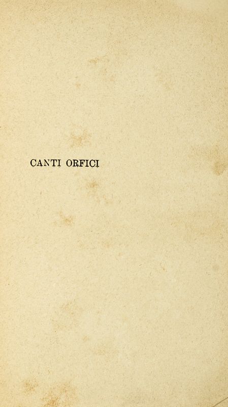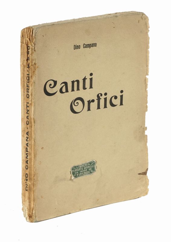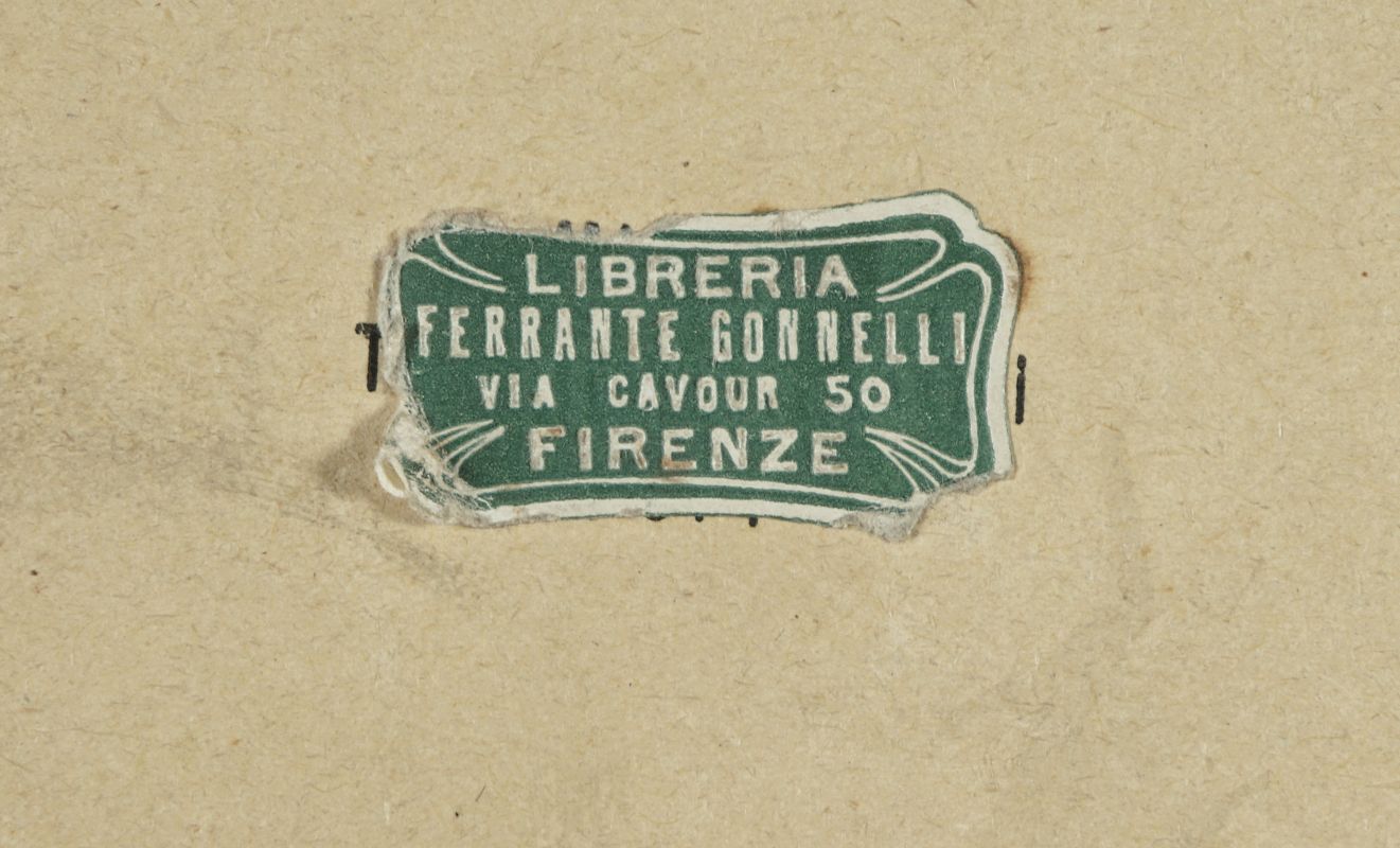 In-8° (mm 195X120). Pagine 173 [i.e. 169], [1]. Occhietto conservato ma assenti frontespizio e pagina di dedica al Kaiser Guglielmo di Prussia. Esemplare con Errata corrige (nella dizione E. C.) sul verso dell'ultima pagina. Il fascicolo delle pp.119-134 è leggermente più corto e la parte finale con le pp.135-173 ancora più corta, come si riscontra negli esemplari usciti per primi dalla tipografia. Brossura editoriale originale in carta con titoli impressi in nero a dorso e piatto anteriore. Etichetta applicata al piatto anteriore: 'LIBRERIA / FERRANTE GONNELLI /VIA CAVOUR 50 / FIRENZE' e, alla brossura posteriore, pecetta cartacea a coprire la parte stampata ('Die Tragödie des letzten Germanen in Italien'). Alcune fragilità in corrispondenza del dorso, con mancanze in corrispondenza delle cuffie, assente l'angolo superiore esterno del piatto posteriore, per il resto buono stato complessivo.
