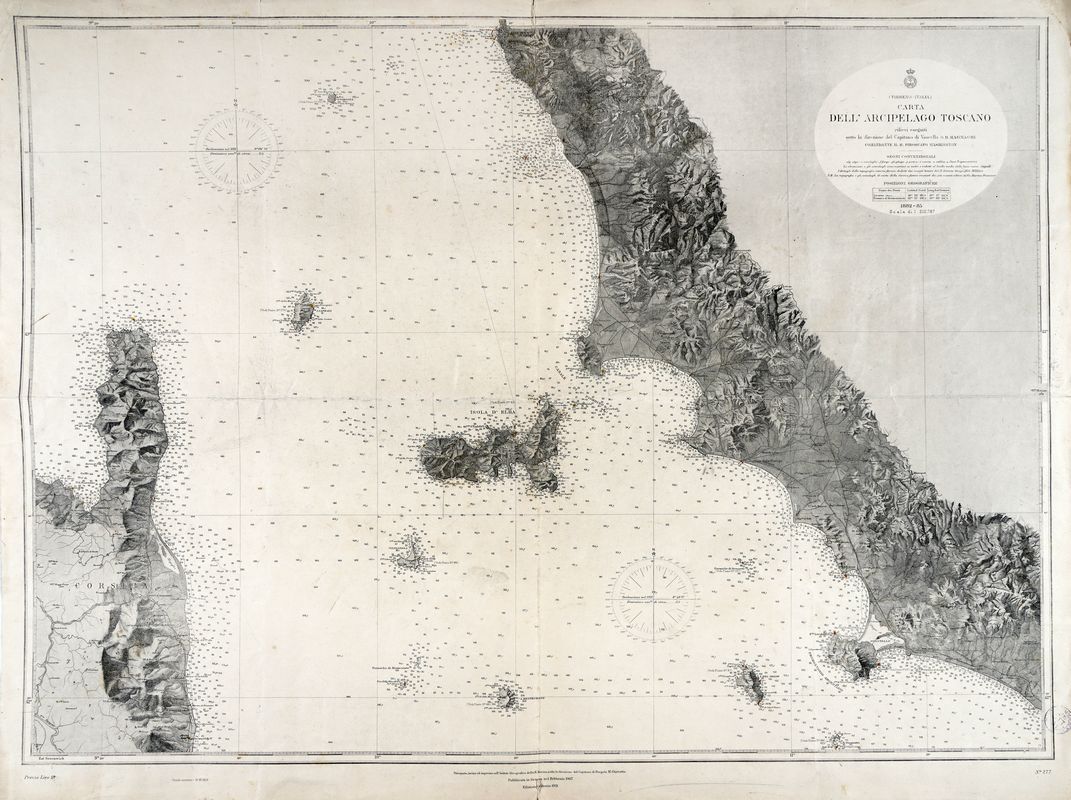 Litografia. mm 725x985. Foglio: mm 790x1100. In basso al centro "Disegnata, incisa ed impressa dall’Istituto Idrografico della R. Marina, sotto la direzione del Capitano di Fregata M. Giavotto/ Pubblicata in Genova nel febbraio 1907/ Edizione febbraio 1921"; e a sinistra la scritta "Piccole correzioni – 19-III-1923". Grandissima carta idrografica entro riquadro a filetto, con l’indicazione delle graduazioni "Est Greenwich", due bussole graduate (una in alto a sinistra, l’altra in basso a destra). Al centro l’Elba, sulla destra la costa toscana da Livorno fino al confine del Lazio (Montalto di Castro) e sulla sinistra una porzione della Corsica nord-orientale. Accurata descrizione del sistema orografico con marcate ondulazioni variamente ombreggiate e numerosissime rilevazioni delle profondità marine.