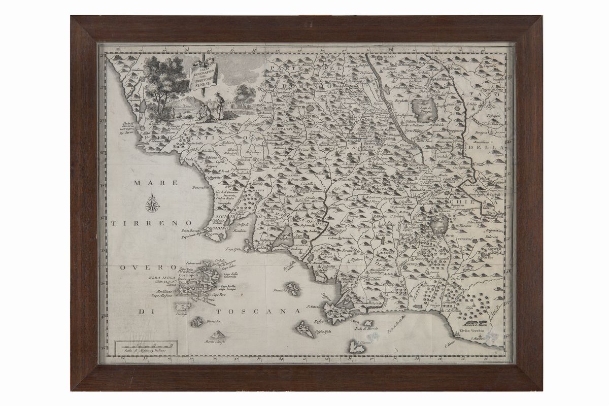 Incisione in rame. mm 330x428. Dal vol. XXI dell’opera di Thomas Salmon Lo stato presente di tutti i Paesi e Popoli del Mondo… pubblicata in 26 volumi da G.B. Albrizzi a Venezia dal 1737 al 1766. Carta geo-topografica racchiusa entro duplice riquadro, con graduazioni su quello più interno e scala in basso a sinistra; il titolo in alto a sinistra su cartiglio sovrastante una graziosa vignetta. Carta molto dettagliata del territorio senese, parte del Dominio Fiorentino e dello Stato della Chiesa, la Signoria di Piombino, la Maremma e lo Stato di Castro; presenti numerosi toponimi di centri abitati, colline sparse, fiumi e laghi; ben delineato il litorale tirrenico dalla foce del Serchio fin oltre Civitavecchia, sulla sinistra piccola rosa dei venti e più in basso le isole dell’arcipelago toscano con l’Elba ben evidenziata.