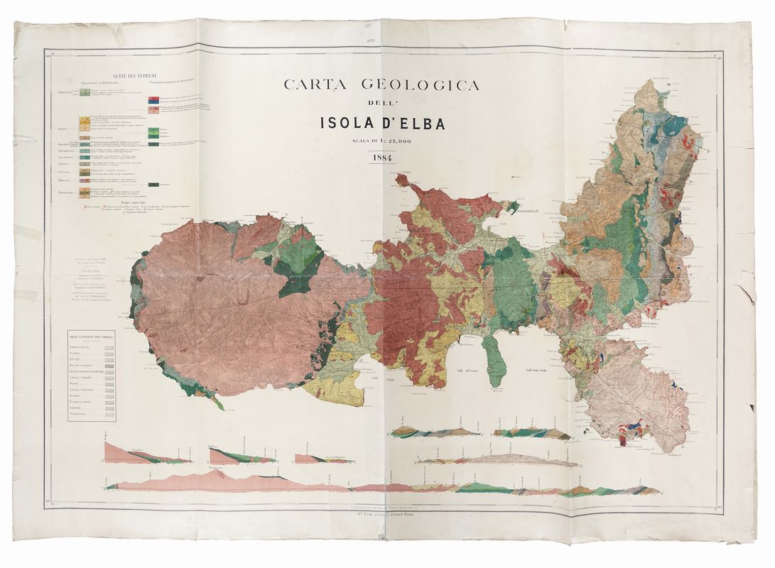 Litografia a colori. mm 900x1320. Con le graduazioni, titolo in alto al centro e note tipografiche al centro in basso. In alto a sinistra la "Serie dei terreni" con richiami dei vari colori e segni convenzionali specifici, più in basso la scritta: "Rilevata nell’anno 1882/ alla scala di 1:10.000/ operatori Ing. B. Lotti/ aiutante P. Fossen/ Per la parte petrografica/ Ing. E. Mattirolo/ coll’alta direzione scientifica/ del Prof. G.e Meneghini…". Da segnalare il lungo profilo altimetrico a colori di tutta l’isola, da Punta Nera a Ovest, al Monte Arco a Est. SI AGGIUNGONO: CARTA GEOLOGICA DELL’ ISOLA D’ELBA/ nella scala di 1: 50.000/ Rilevata nel 1882 alla scala di 1:10.000. 1885. Litografia a colori. mm 540x760. Con le graduazioni, titolo in alto a sinistra, legenda a destra con 25 richiami a colori per la "Serie dei terreni" e in basso alcuni profili altimetrici a colori e altri 12 richiami geologici. Trattasi della stessa carta geologica, qui in proporzioni dimezzate, della precedente. / Isola d'Elba. Carta topografica pubblicata dall'Istituto Geografico Militare. 1899. Xilografia. mm 310x418. Da Emanuele Foresi, L’Isola d’Elba. Pagine di storia antica e moderna, Pitigliano, Paggi 1899. Carta dettagliata, ricca di toponimi, con il profilo orografico ben delineato e il disegno delle isobate molto preciso.