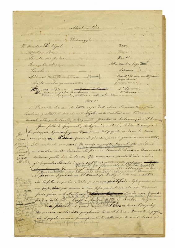Manoscritti a inchiostro nero e matita grigia. 57 pagine scritte. Con correzioni e cancellature. Le carte contengono versi poetici, abbozzi di lettere, un paio di piccoli disegni, il "Sunto del Romanzo I Misteri di una Principessa" e alcuni appunti de "Il Conte di Montecristo". Dimensioni varie.