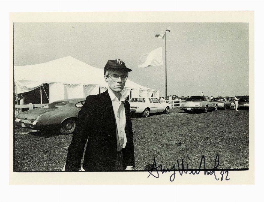 Foto cartolina in b/n con firma autografa e anno (’82) a penna nera, sia sul fronte che sul retro. Fotografia di Christopher Makos. Dimensioni: 150x110 mm.