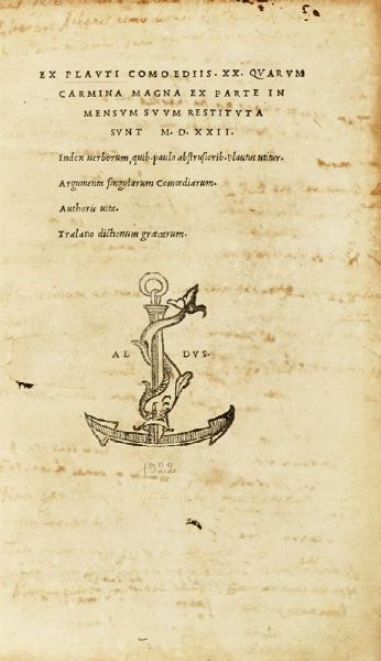 In-4° (mm 210x134). Carte [14], 284. Marca aldina al frontespizio, ripetuta in fine. Pagina del frontespizio staccata, con mancanza di carta reintegrata nel margine interno (senza perdita di testo). Strappo richiuso nel margine di carta 101. Copia brunita, con bruniture più intense ad alcune carte. Legatura settecentesca in pieno vitello con titoli impressi in oro su talso tassello al dorso e decorazioni dorate ai comparti. Tagli spruzzati. Piatto anteriore staccato, mancanze lungo il dorso. Note manoscritte al verso della carta di frontespizio (visibili in alcuni punti anche al recto), numerose postille di mano antica a gran parte delle carte, talvolta sbiadite.