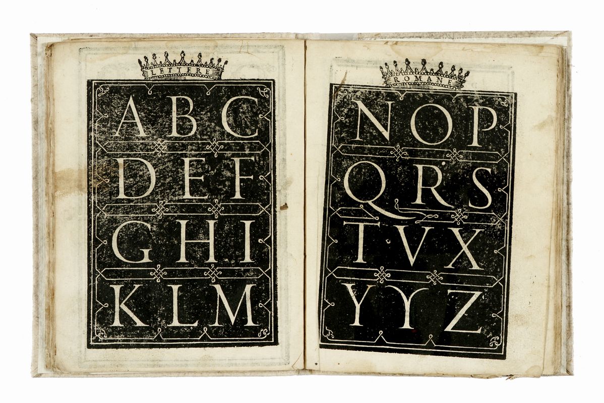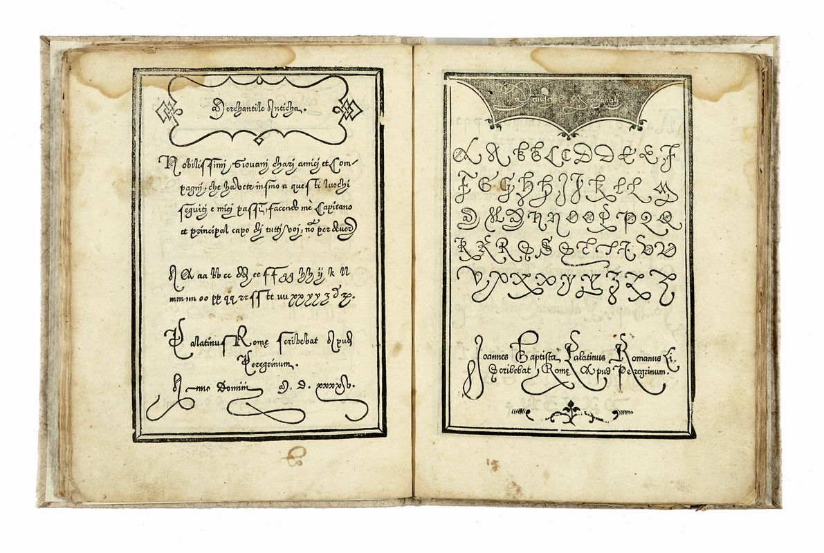 In-4° (mm 188x135). Carte [60] di [62]. Numerose tavole calligrafiche incise in legno nel testo. La prima e l'ultima carta assenti e supplite da facsimili, copia ricomposta (i fascicoli A-C più corti di margini) alcune macchie e gore nel margine superiore delle carte. Legatura moderna in pieno cartonato rustico. Nel testo numerose prove di scrittura di antica mano.