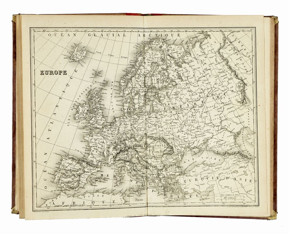 3 volumi (2 di testo e 1 di atlante) in-8° (mm 226x138). Pagine CXII, 1094, [6]; 982, 2 bianche + 23 tavole geografiche a doppia pagina rilegate in un volume a parte. Carte diffusamente fiorite ai due volumi di testo, con bruniture in corrispondenza dello specchio di stampa. Legatura in mezza pelle rossa con punte in pergamena e piatti in percallina e titoli impressi in oro al dorso. Tagli spruzzati. Scoloriture ai piatti, piccole mancanze alle cuffie. SI AGGIUNGE: Lecoq Henri, Éléments de Géologie et d'hydrographie... Bruxelles: Société typographique belge, 1839. In-8° (mm 244x158). SI AGGIUNGE: Id., Éléments de Géographie physique et de météorologie... Bruxelles: Société typographique belge, 1840. In-8° (mm 243x159).
