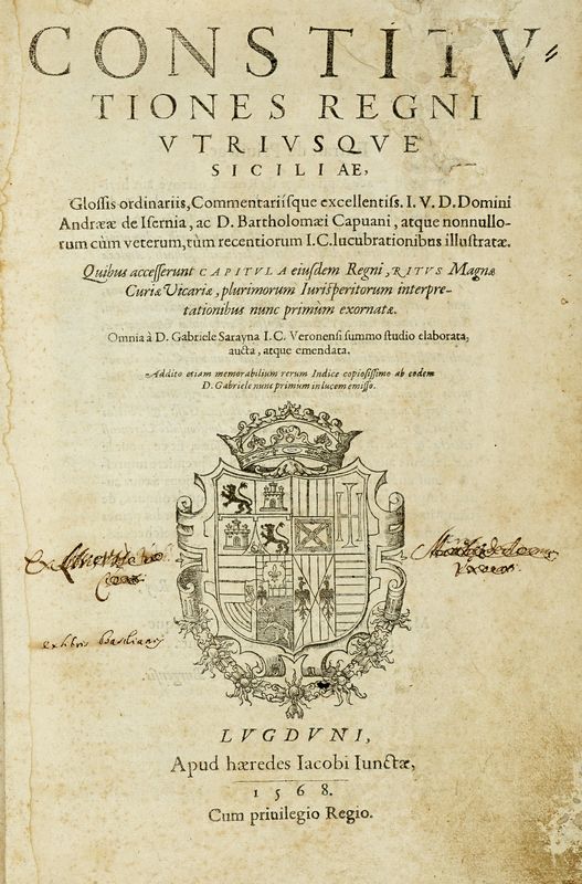 In folio (mm 315x210). Pagine [44], 460, [124]. Frontespizio gorato, con strappi richiusi al verso. bruciatura con perdita di testo a carta H5. Copia diffusamente brunita, con bruniture più intense ad alcuni fascicoli di testo. Legatura in piena pergamena con titolo manoscritto al dorso. Note di possesso manoscritte, in parte cassate, al frontespizio. postille di mano antica passim.