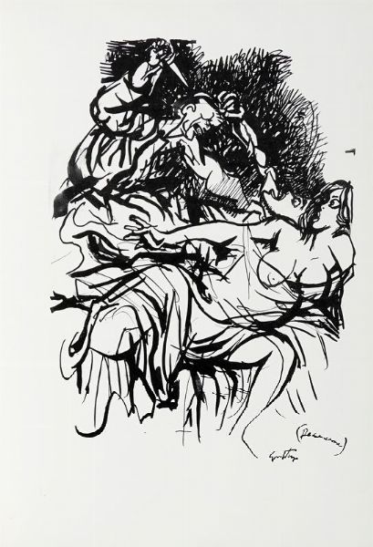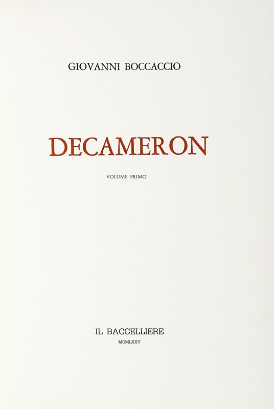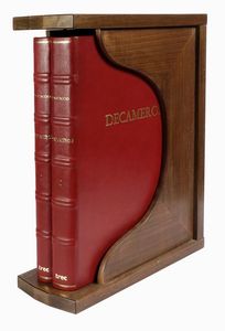 2 volumi in-folio (mm 480x340). Con, complessivamente, 42 tavole a colori di vari autori, tra cui Renato Guttuso, Emilio Greco, Aligi Sassu e molti altri. Ottimo stato di conservazione. Legatura editoriale in piena pelle, con titoli in oro al piatto e al dorso a 5 nervi. Entro cofanetto in legno. Uno dei 1000 esemplare a numerazione araba, su una tiratura complessiva di 1521.