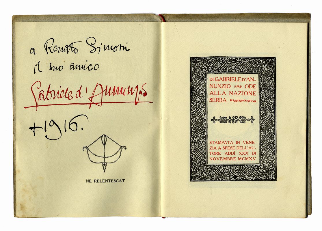 Manoscritto a inchiostro nero e rosso. Frontespizio a stampato in rosso entro cornice nera. Un secondo frontespizio (nero e rosso) "Ode. Hinc spes". Al controfrontespizio le parole (a stampa) "Ne relentescat" e la dedica autografa di d’Annunzio: "A Renato Simoni / il suo amico / Gabriele d’Annunzio / 1916". Carte protette da cartoncino originale grigio azzurro (con stemma serbo). Fogli spillati e riuniti al cartoncino dall’originale cordoncino rosso. Bell’esemplare. Molto raro.
