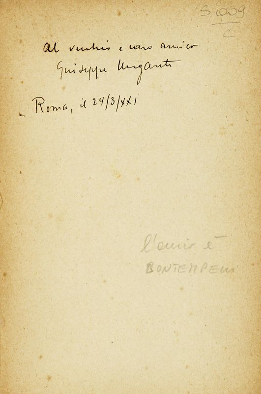 Manoscritto a inchiostro nero. Dedica al foglio di guarda anteriore, probabilmente a Massimo Bontempelli. Brossura originale, internamente staccata al piatto anteriore.