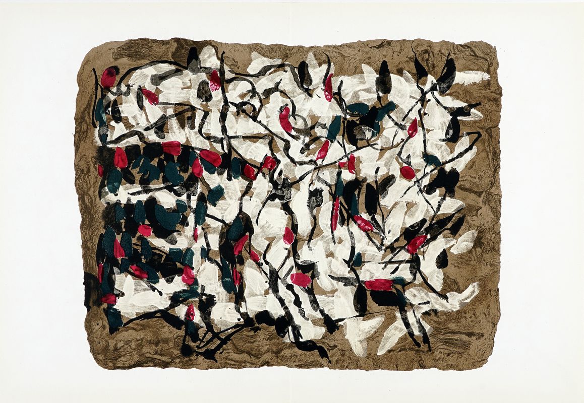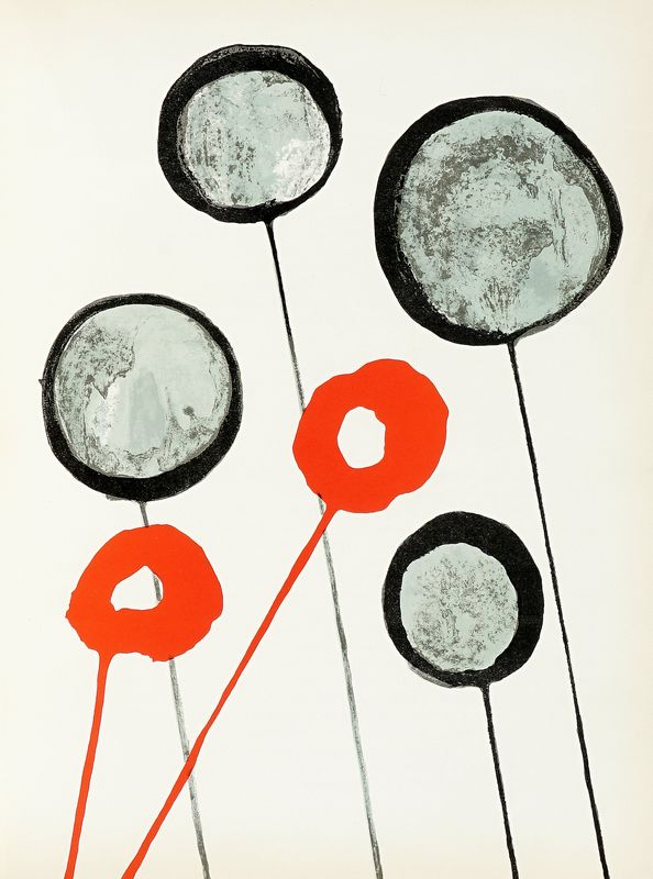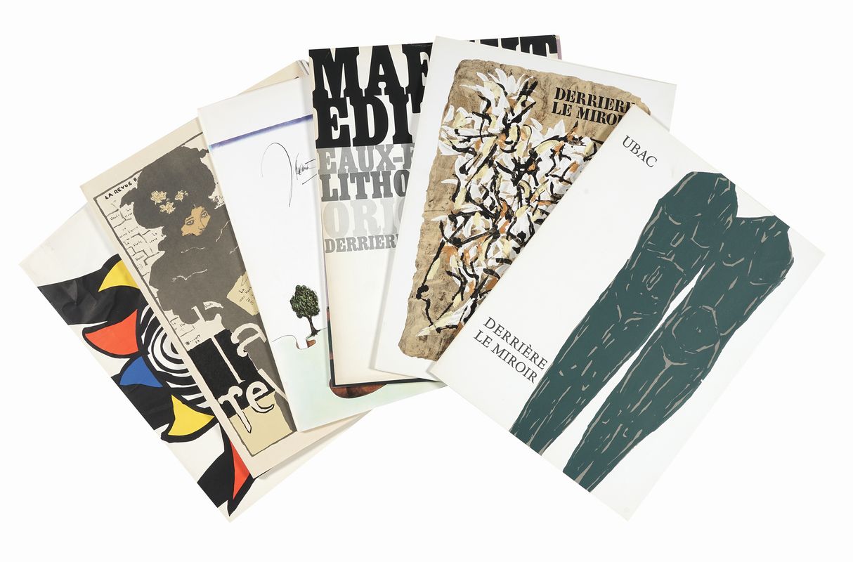 7 numeri in 6 fascicoli sciolti In-folio piccolo (380x280). Dal n. 156 (febbraio 1966) al n. 162 (novembre 1962). Il lotto si compone del n. 156: Calder. Con 7 litografie originali, di cui 2 a doppia pagina e 1 doppia alla brossura; n. 157: Steinberg; nn. 158-159: La Revue blanche. Con 11 tavole a colori e in bianco e nero da Bonnard, Denis, Toulouse-Lautrec e altri; n. 160: Riopelle. Con 9 litografie originali, di cui 2 a doppia pagina e 1 al piatto anteriore; n. 161: Ubac. Con 7 litografie originali, di cui 1 sciolta e più volte ripiegata e 2 alla brossura; 162: Francis Bacon. Con le litografie a colori dell'Artista, di cui 1 al piatto anteriore della brossura. Ogni fascicolo, in brossura editoriale illustrata e protetta da velina, contiene all'interno il rispettivo Chroniques. Difetti alle veline. Il n. 156, su Calder, presenta alcune pieghe e il n. 158-159 lievi gore marginali. SI AGGIUNGE: Eaux-fortes et litographies originales. Derriere le Miroir Affiches. Paris: Maeght, 1966.
