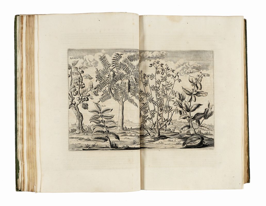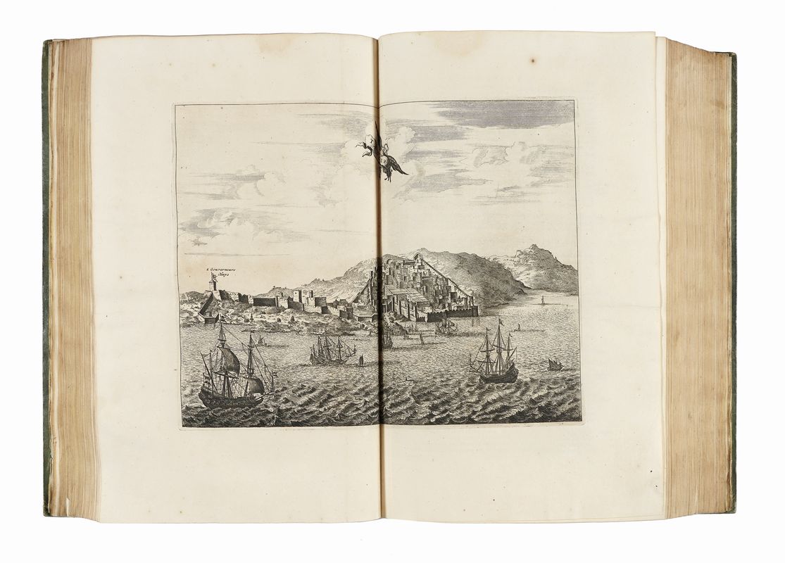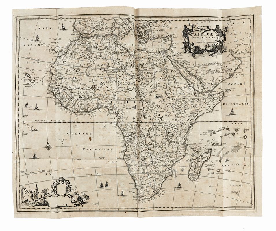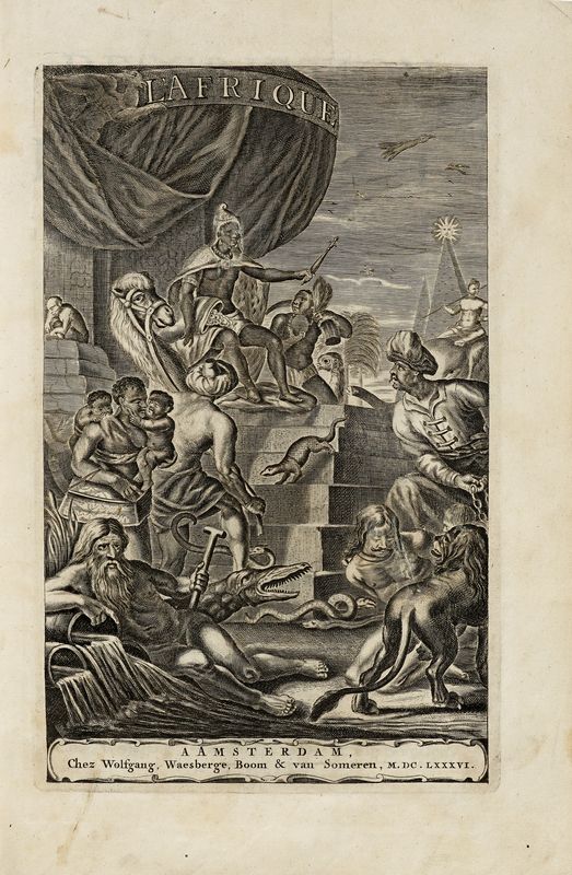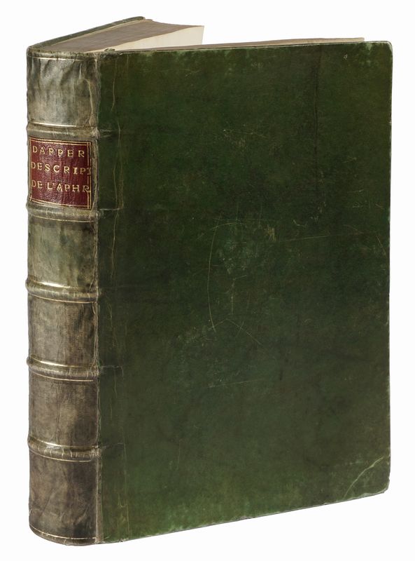 In-folio (mm 365X235). Pagine [6], 534, [22]. Con, fuori testo, 1 bella antiporta figurata e 43 tavole a doppia pagine e più volte ripiegate, raffiguranti carte geografiche dell'Africa, dell'Egitto, del Marocco, della Guinea, del Congo etc..., piante e vedute delle principali città; il tutto finemente inciso in rame. Numerose vignette calcografiche nel testo, che illustrano usi, costumi, cerimonie, animali e piante. Marca tipografica in rame al frontespizio. Mancanza reintegrata al margine inferiore del frontespizio, senza perdite di inciso, qualche gora marginale alla prima parte del volume e bruniture sparse, altrimenti buona copia. Legatura successiva in piena pelle verde, con piatti rimontati e titoli in oro su tassello al dorso a 5 nervi. Rare macchie ai piatti, e qualche lieve mancanza a quello posteriore e alle punte, ma nel complesso buona copia.