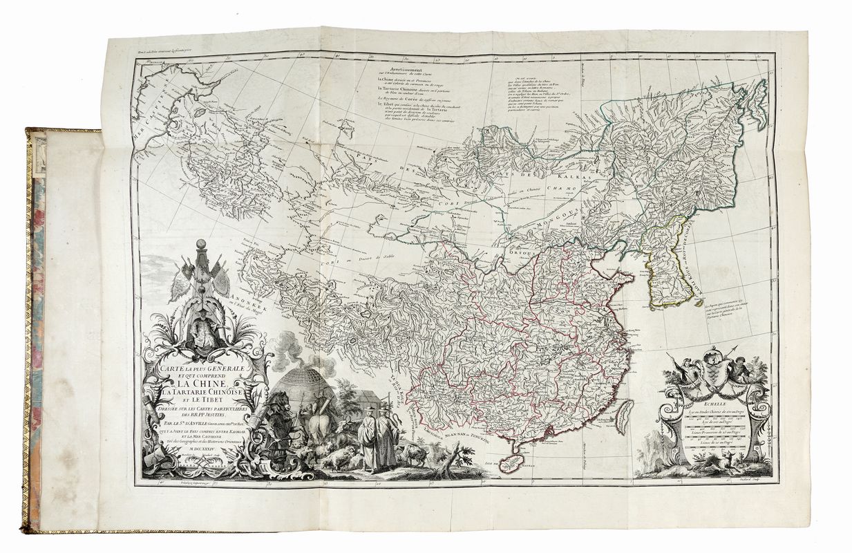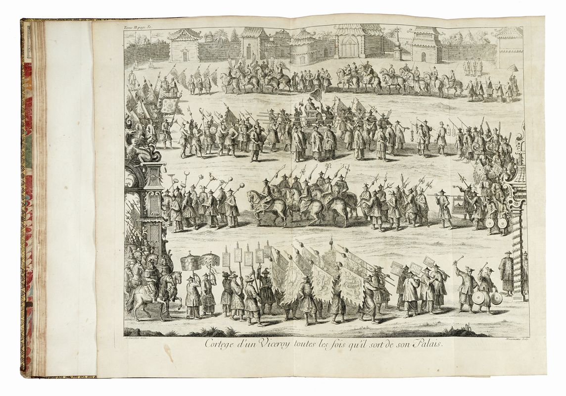 4 volumi in folio (mm 432x275). Pagine [4], VIII, LII, III, [1], 592 [i.e. 590] + 25 carte geografiche più volte ripiegate o a doppia pagina; [4], IV, 725, [1] + 10 carte di tavole a piena e doppia pagina; [4], IV, 564, [3], 1 bianca + 5 carte di tavole; [4], II, 520 [i.e. 518] + 25 carte geografiche più volte ripiegate. Con nel complesso 65 tavole incise in rame fuori testo, con mappe, vedute e raffigurazioni di costumi e riti religiosi cinesi. Frontespizi in inchiostro rosso e nero con vignetta calcografica, testatine incise sia in rame che in legno, capilettera e finalini xilografici. Al primo e al terzo volume volue gora d'acqua nel margine inferiore degli ultimi fascicoli, fioriture sparse, alcune carte lievemente e uniformemente brunite, sporadiche macchie, nel complesso buona copia. Legatura coeva in pieno vitello con titoli e decorazioni in oro ai comparti del dorso, tagli spruzzati in rosso, sguardie marmorizzate. Alcune mancanze lungo le cerniere e in corrispondenza dei dorsi. Ex-libris di precedente proprietario al contropiatto anteriore, nota di possesso manoscritta sul frontespizio di ciascun volume.