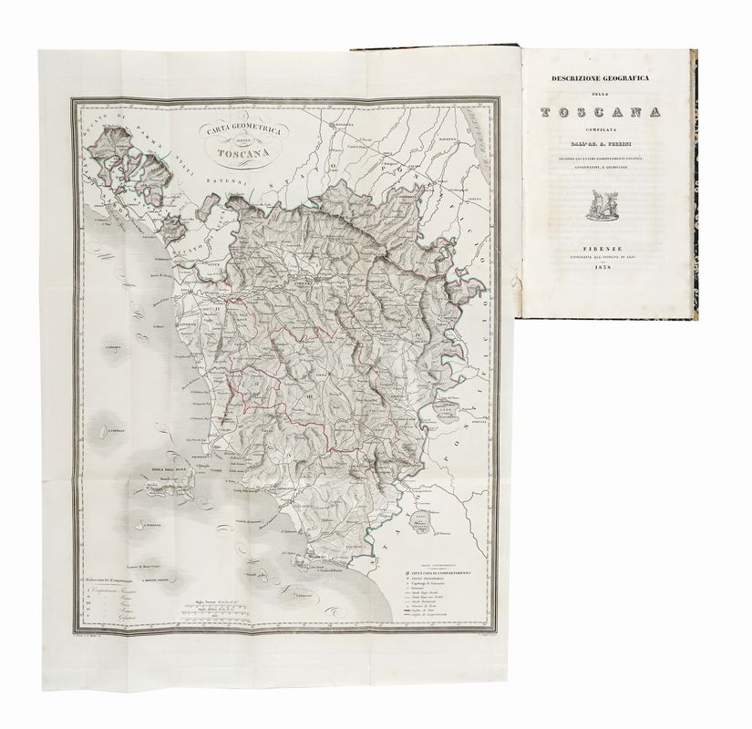 In-8 (mm 228x140). Con una carta geometrica della Toscana, più volte ripiegata fuori testo, con linea dei confini in coloritura. Uno strappo restaurabile alla carta, altrimenti ottimo stato di conservazione. Legatura coeva in mezza pelle, con piatti marmorizzati, fregi e titoli in oro al dorso.