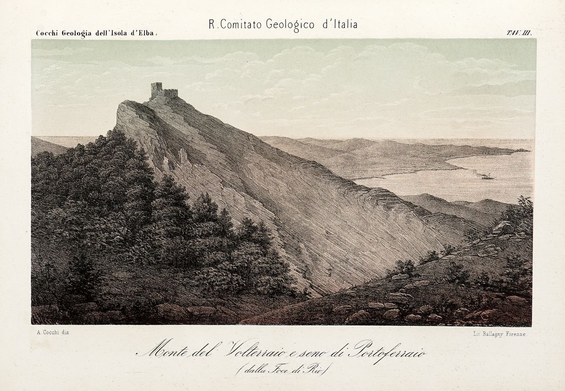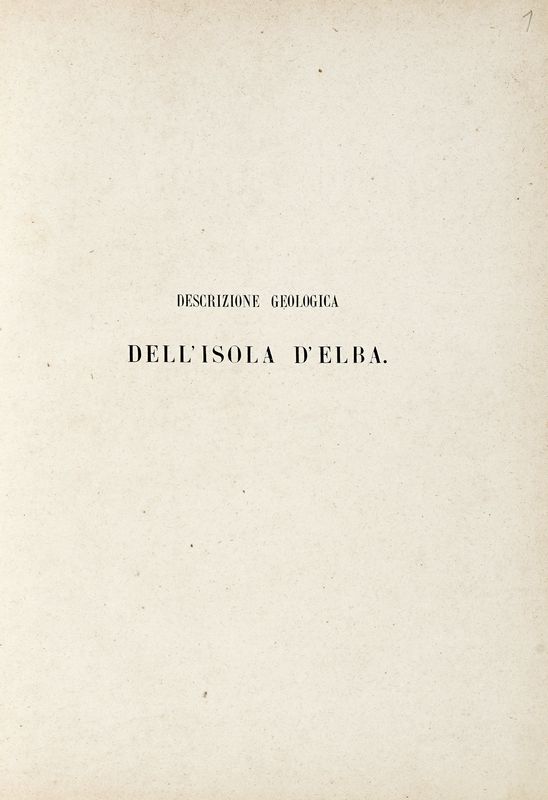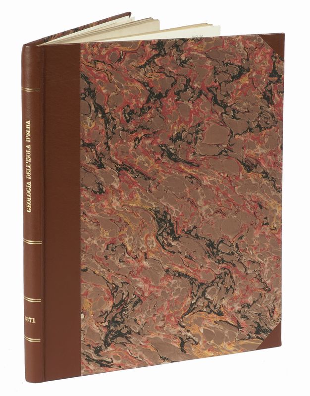 In-4° (mm 330x237). Pagine 168, [4]. Con 1 carta geologica della parte orientale dell'Isola d'Elba ripiegata e 7 tavole; il tutto a colori, fuori testo e protetto da velina. Numerose illustrazioni in acciaio nel testo. Lievi difetti alle veline, altrimenti fresco esemplare perfettamente conservato. Legatura in mezza pelle, con punte e piatti marmorizzati; titoli in oro al dorso.