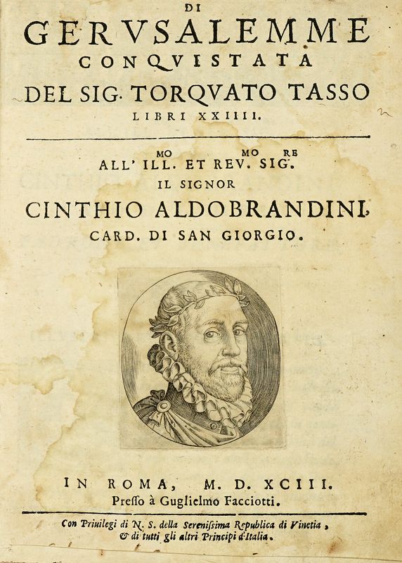 In-4° (mm 210x160). Pagine [12], 290, [2]. Ritratto calcografico dell'Autore al frontespizio; testatine e capilettera in legno. Esemplare rifilato, con ampie gore ai primi fascicoli, bruniture e fioriture a gran parte del volume. Mancante il margine inferiore del frontespizio, senza perdite di inciso; rinforzo marginale alla carta A1. Una mancanza con perdite alla carta C1 e uno strappo maldestramente restaurato alla carta Y1. Legatura coeva in piena pergamena con titoli manoscritti al dorso. Sguardie rinnovate, cuffia superiore ricostruita. Lievi difetti.