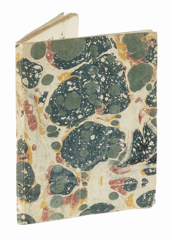 In-4° (mm 210x155). Pagine 86, [2]. Alcuni legni nel testo, scompleto - come di consueto - della carta ripiegata in fine. Sporadiche bruniture in corrispondenza dello specchio di stampa, una lievissima gora d'acqua, per il resto ottima copia, ben impressa. Brossura ottocentesca in carta decorata, sguardie rinnovate.
