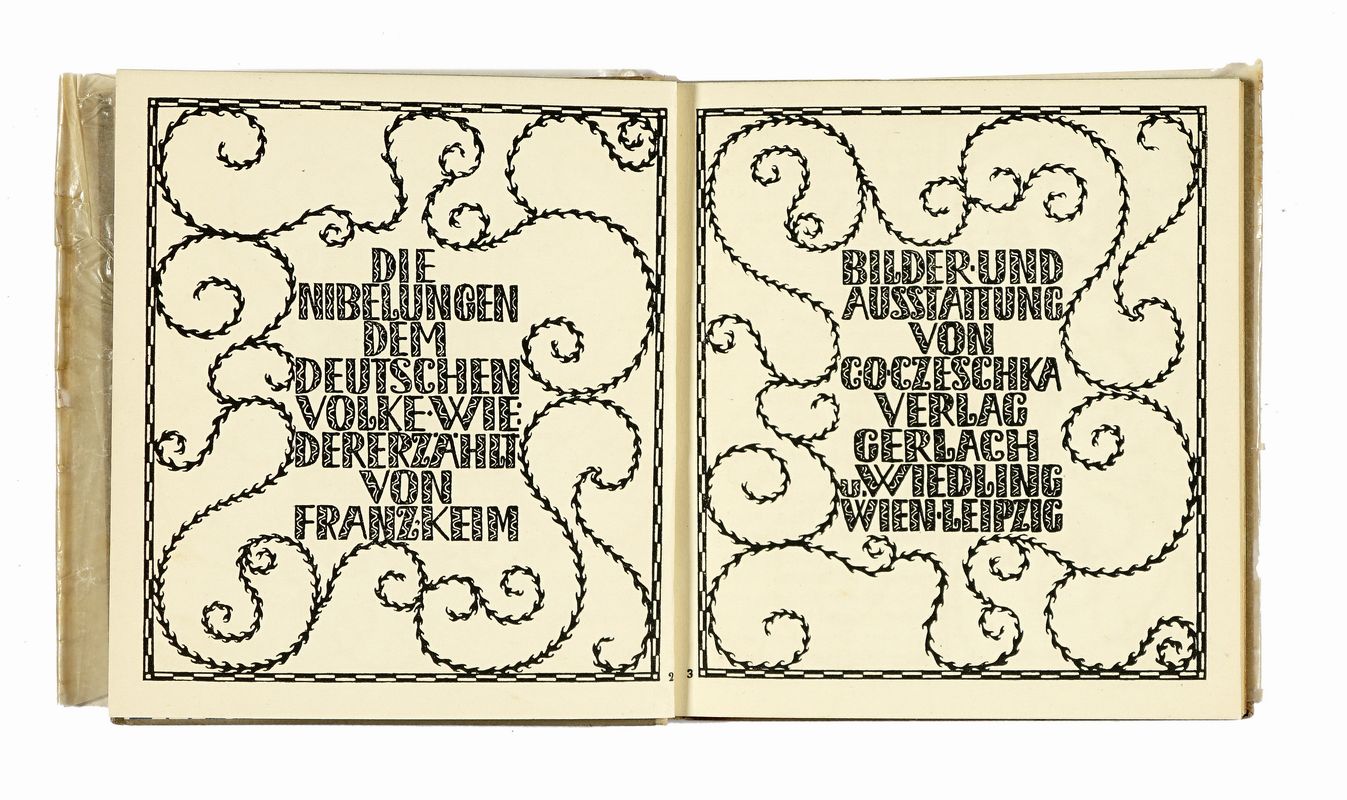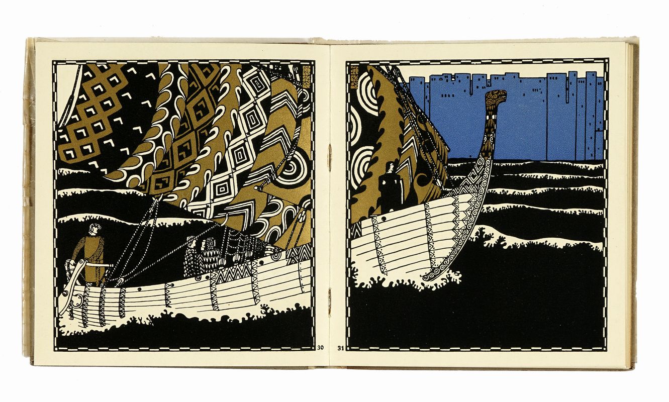 In-12° (mm 146x130). Pagine 67, [1]. Con, nel testo, 16 bellissime tavole litografiche a colori di Otto Carl Czeschka, ritoccate in oro. Testo e tavole in graziosa cornice bianca e nera. Legatura originale in mezza tela protetta da velina, con titolo impresso al piatto anteriore, sguardie in carta decorata e taglio superiore blu. Difetti alla velina e lievi gore ai piatti, altrimenti ottima copia.