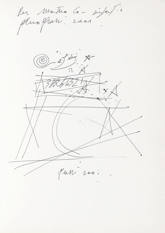 Disegno e dedica all’occhiello, a inchiostro nero. Dimensioni: 240x240 mm.