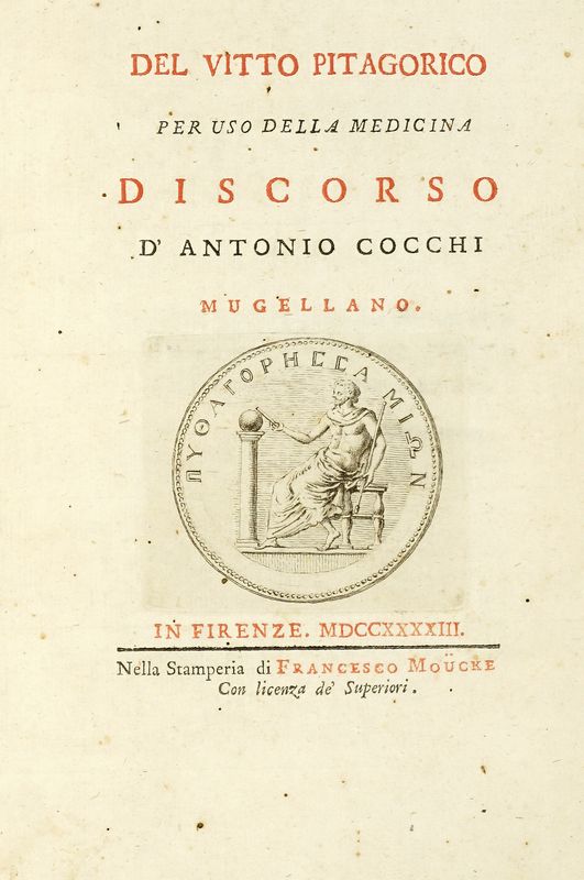 4 volumi in-8° (mm 190x120). Legatura successiva in mezza pelle con punte e piatti in carta decorata. Titoli in oro al dorso. SI AGGIUNGE: Cocchi Antonio, Del vitto pitagorico per uso della medicina. In Firenze: nella stamperia di Francesco Moucke, 1743.