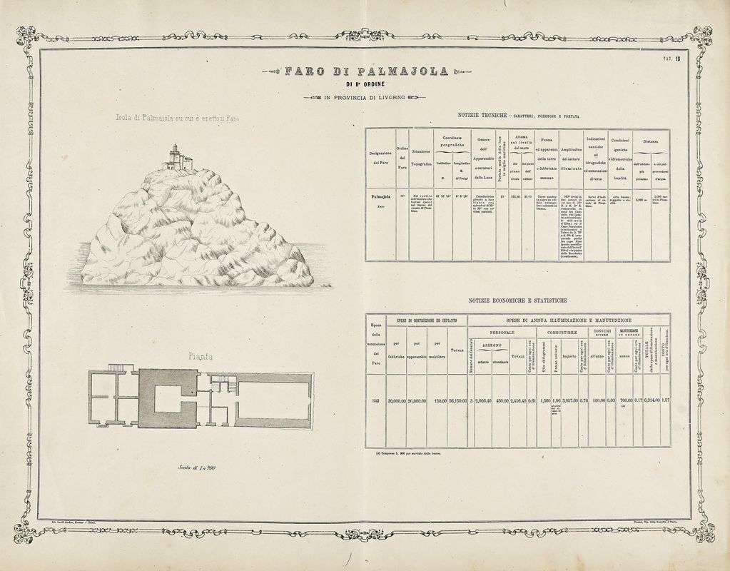 Litografia. mm 390x530. Foglio: mm 440x565. Tavola 18 (Faro di Palmajola) e tavola 47 (Faro di Longone) lotto di due litografie da Album dei Fari illustrato dalle notizie intorno ai loro caratteri e posizione non che da quelle intorno alle spese di costruzione ed impianto e di annuo loro mantenimento ed illuminazione, Roma, 1873. Raccolta del primo importante censimento, con dati e immagini, di tutti i fari dell'Italia con 98 grandi tavole in litografia ripiegate.