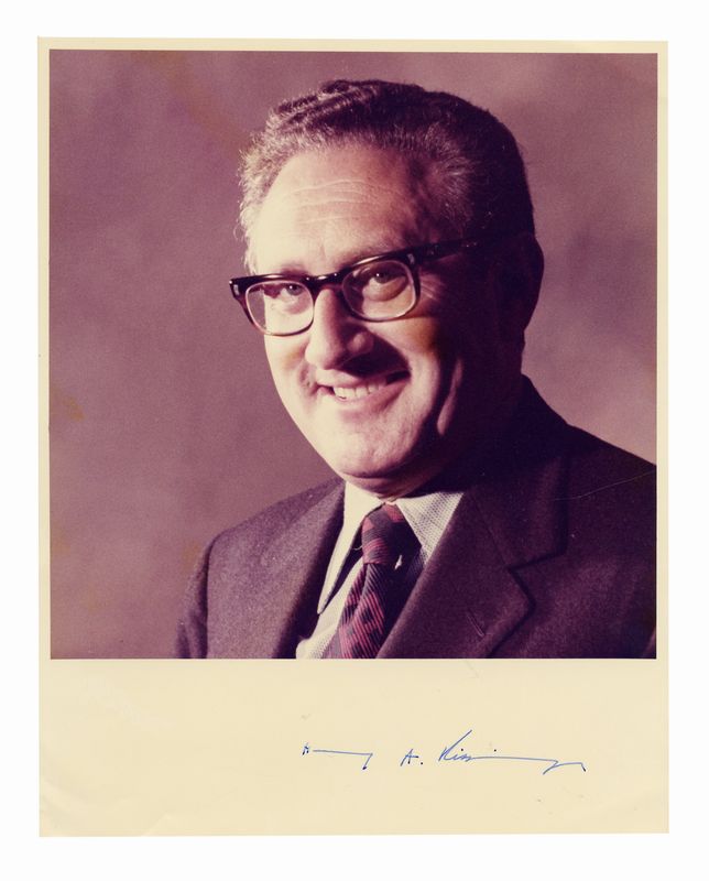 La fotografia a colori, che ritrae il segretario di Stato Henry Kissinger nel 1973, è autografata a penna blu: "Henry A. Kissinger". Su retro, il timbro Official Photograph The White House con la data "6 Ma 73" e il numero di serie E390-29. Ottime condizioni. Dimensioni 200x255 mm.