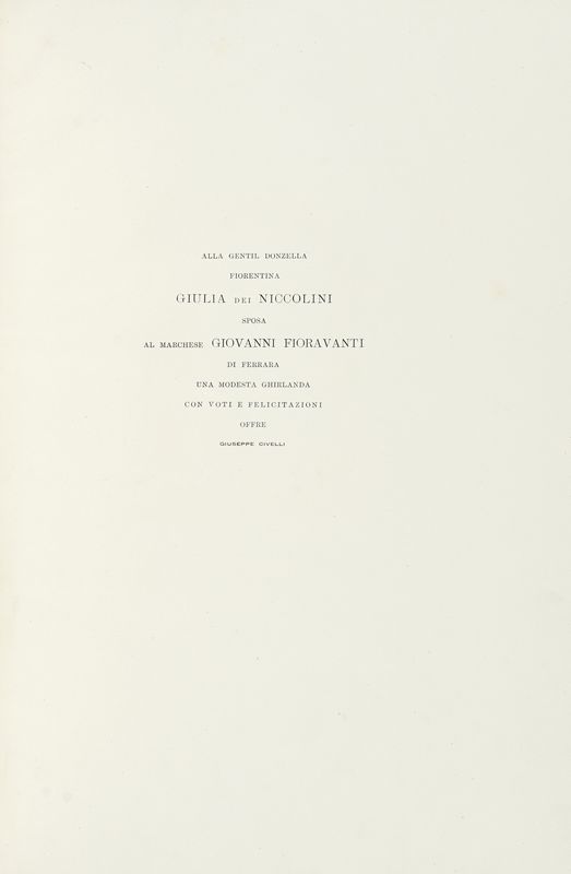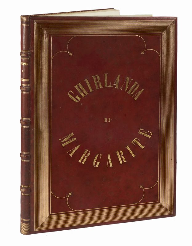 In folio (mm 480x322). Carte [42]. Testi inquadrati dentro preziose cornici impresse a colori su fondo oro o argento. Ottimo stato conservativo. Bella legatura coeva in pieno marocchino rosso con ampie cornici concentriche impresse in oro ai piatti e titolo impresso a dorso e centro del piatto anteriore. Tagli dorati, sguardie in seta. Conservato entro custodia in pelle foderata in carta marmorizzata. Custodia con rotture.