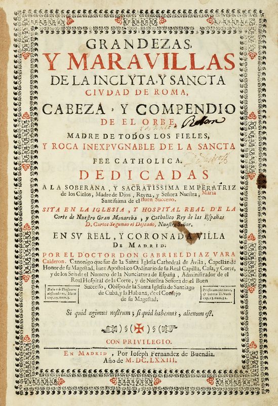 In-folio (mm 280x197). Pagine [20], 705 [i.e. 715], 1 bianca, [38] con 6 tavole fuori testo in calcografia, di cui 4 tavole a piena pagina, una carta ripiegata di Roma e una veduta di San Pietro. Restaurata al verso la carta di Roma, gora d'acqua nella veduta, un maldestro restauro nel margine interiore della carta 2V5 ma per il resto buono stato complessivo. Errori di numerazione. Legatura successiva in piena pelle spugnata con cornici dorate ai piatti, titolo in oro su tassello al dorso e fregi dorati ai comparti. Tagli rossi, sguardie in carta decorata. Mancanze lungo le cerniere. Ex-libris di precedenti proprietari al contropiatto anteriore.