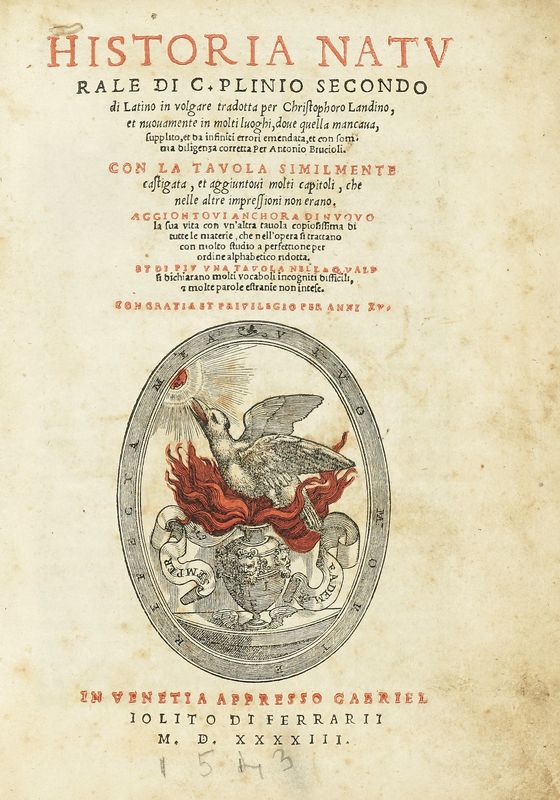 In-4° (mm 213x155). Pagine [40], DCCCCXXXIIII, [2]. Frontespizio impresso in rosso e nero, con ritocco a colore rosso sulla marca tipografica. Marca tipografica ripetuta in fine. Leggere fioriture nel testo, più intense alle prime e ultime carte. Legatura settecentesca in piena pergamena rigida con titoli in oro su falso tassello al dorso. Tagli blu. Buono stato complessivo. Ex-libris di precedente proprietario applicato al contropiatto anteriore.