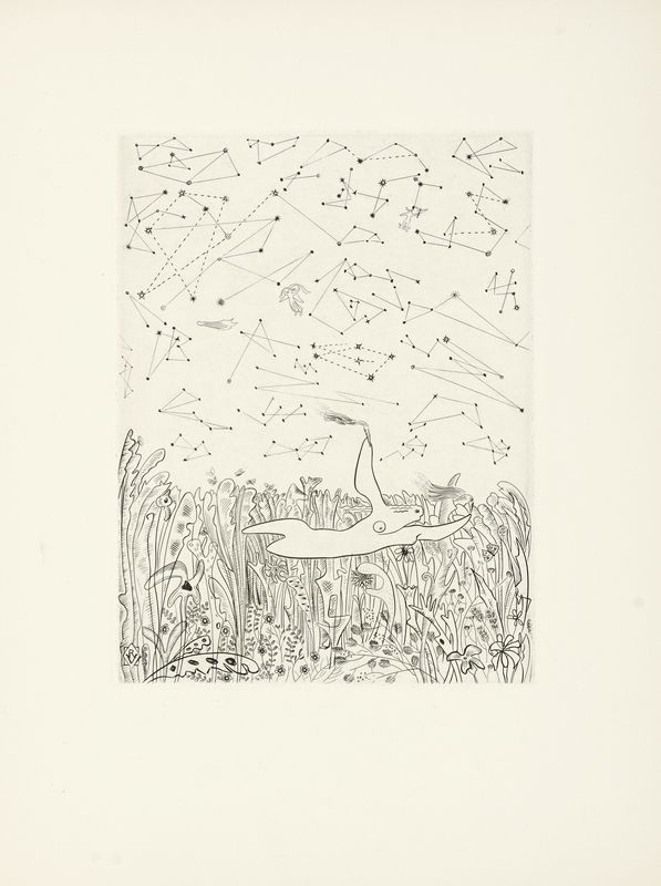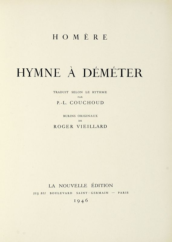 In-4° (mm 325x240). Marginoso esemplare in barbe, parzialmente intonso, con 6 belle incisioni a bulino fuori testo di stampo surrealista di Roger Vieillard, di cui una in antiporta. Brossura editoriale con sovraccoperta; entro camicia e custodia originali in pieno cartonato, con titoli al dorso. Difetti al dorso della camicia e alla custodia, altrimenti ottimo stato di conservazione. Uno dei 230 esemplari su papier vélin blanc crève, su una tiratura di 300 copie. Dedica a matita dell'Artista all'occhietto.