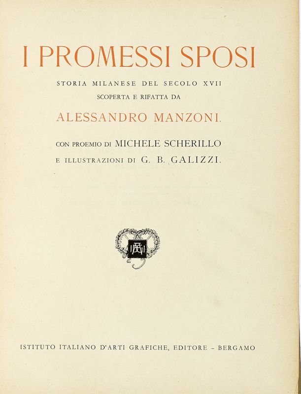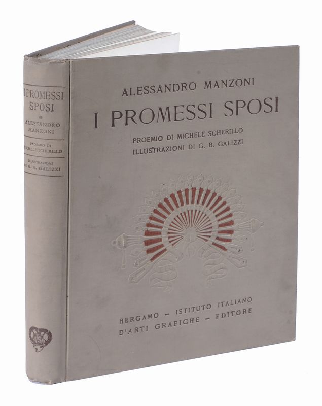 In-4° (mm 290x215). Pagine XXIII, [1], 396. Con ritratto del Manzoni all'antiporta, dal dipinto di Hayez, 47 carte di tavole fuori testo protette da velina (12 in seppia e 35 a colori) e 76 illustrazioni nel testo, opera di Giovan Battista Galizzi. Ottimo stato di conservazione. Legatura editoriale in piena tela avana con titolo e impressione argentata al piatto anteriore; riproposizione dei dati editoriali al dorso. Dedica manoscritta datata 1927 alla carta di guardia anteriore.