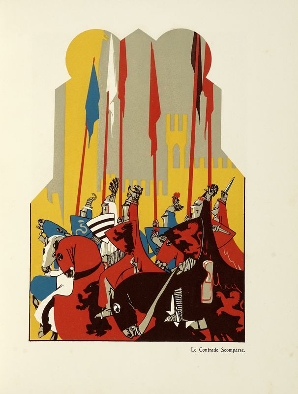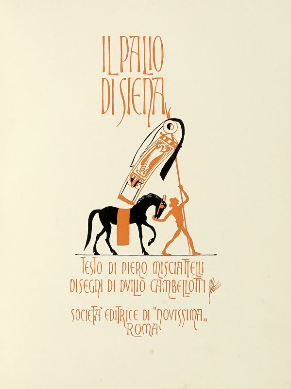 In-4° (mm 340x264). Pagine 149, 3 bianche con molte e bellissime xilografie a colori nel testo, di cui 29 a piena pagina, raffiguranti stemmi delle contrade e momenti del Palio. Internamente sporadiche e rare fioriture, per il resto in ottimo stato di conservazione. Bella legatura editoriale in piena pelle con titolo e stemma impressi a secco con finiture in tessuto colorato al piatto anteriore e rappresentazione di leone, sempre a secco, a quello posteriore. Sguardie decorate. Piatti leggermente lisi, lieve macchia visibile al piatto anteriore. Tiratura in 1000 esemplari numerati.