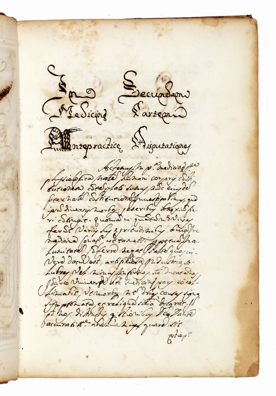 Manoscritto a inchiostro bruno. Carte [2], 193, [3]. Testo in latino. Indice in fine al testo. Un restauro antico alle ultime due carte. Legatura in pergamena coeva. Dimensioni: 190x130 mm. SI AGGIUNGE: Trattato delle fasciature. Manoscritto. Pagine [58]. Prima metà del XIX secolo. Alcuni difetti ai piatti e alla costola.