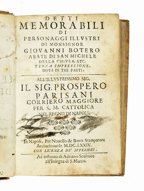 In-4° (mm 205x150). Carte [4], 172. Marca al frontespizio. Mancanza reintegrata nel margine esterno del frontedpizio, senza perdite di testo, un piccolo forellino di tarlo nel margine interno delle prime carte, per il resto buona copia, fresca e completa. Legatura in piena pergamena floscia con legacci. Titolo manoscritto al dorso. SI AGGIUNGE: Botero Giovanni, Detti memorabili di personaggi illustri. In Napoli: per Novello de Bonis stampatore arcivescovale, 1674.