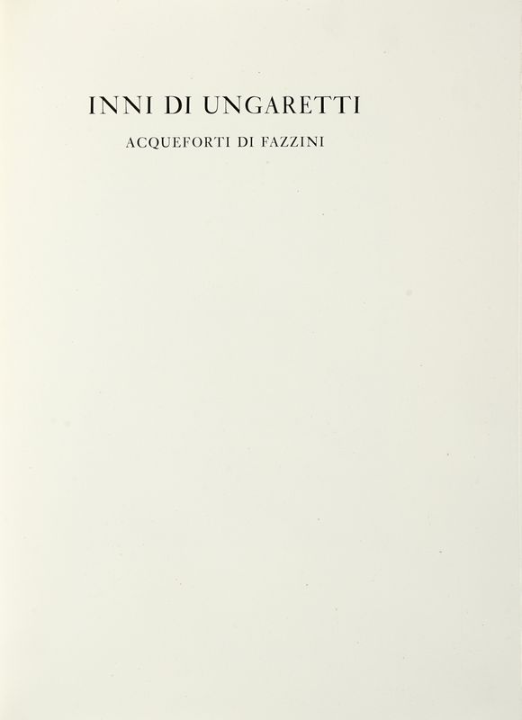 In-4° grande (mm 370x270). Pagine 33, [5]. Con 3 acqueforti di Pericle Fazzini a piena pagina nel testo (mm 220x145. Foglio: mm 335x262), firmate a matita dall'Artista. Ottimo esemplare in barbe. Brossura editoriale con sovraccoperta in cartonato blu, illustrata al piatto anteriore e rivestita da plastica protettiva removibile. Entro cartella e astuccio editoriali in cartonato blu; quest'ultimo con minimi segni di usura. Tiratura a 150 esemplari numerati. SI AGGIUNGE: Petrarca Francesco, Venti sonetti da Il canzoniere. Con quattro acqueforti di Domenico Cantatore. Ancona: Bucciarelli Brenno, 1963. In-4° (mm 365x260). Esemplare in barbe, con 4 belle acqueforti di Domenico Cantatore piena pagina nel testo, di cui una in antiporta, firmate a matita in basso a destra. Legatura in pieno cartonato rigido, con titoli al piatto. Lievi macchioline. Uno dei 100 esemplari numerati. SI AGGIUNGE: Catullus Gaius Valerius, Ad Lesbiam. Verona: Franco Riva, 1965. In-folio (mm 380x280). Con due eleganti acqueforti originali firmate da Achille Funi nel testo.