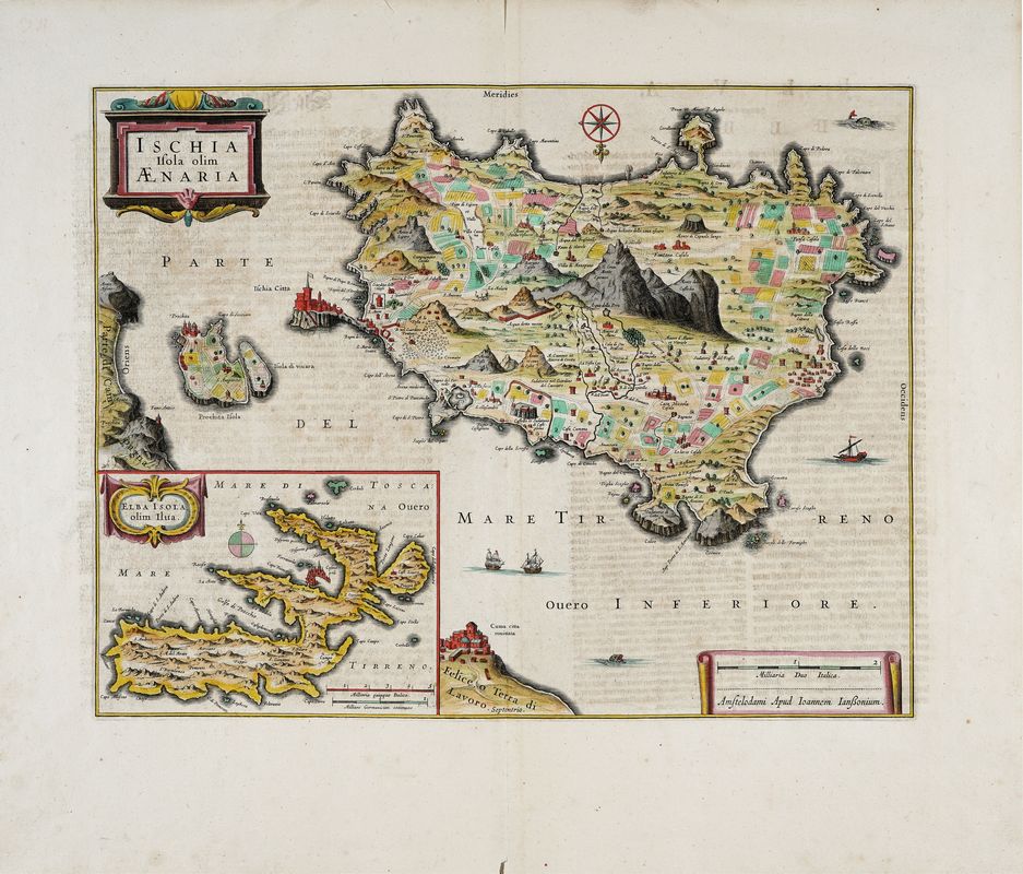 Incisione in rame in coloritura. mm 352x45. Foglio: mm 500x590. Dall'edizione tedesca dell'Atlas Novus. Carta geografica con la raffigurazione delle due isole, con abbondanti descrizioni topografiche, al verso il testo storico-descrittivo in tedesco su due colonne. Al centro dettagliata carta geo-topografica di Ischia vista da nord, con due cartigli, rosa dei venti, isola di Procida, alcuni velieri e mostri marini; ben delineato il perimetro costiero, con gli isolotti e gli scogli vicini, le varie località, monti, corsi d’acqua, alberi e appezzamenti agricoli variopinti. In basso piccola veduta di "Cuma città rovinata", porzione della "Terra di Lavoro" e sulla destra un cartiglio per la scala distanziometrica e le note tipografiche. In basso a sinistra, entro riquadro di mm 135x190, è raffigurata l’isola d’Elba nella versione del Magini e poi del Blaeu, qui assai rimpicciolita, con proprio cartiglio per il titolo e duplice scala distanziometrica.