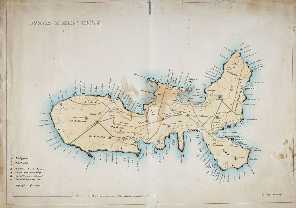 Penna e bistro, pennello e acquerello a colori grigio, azzurro, marrone, verde, giallo e rosa. Carta spessa non vergellata color avorio "J WHATMAN / TURKEY MILL". mm 544x765. Carta geo-topografica, disegnata a mano con inchiostro di china, entro riquadro a filetto. In alto il titolo, in basso a sinistra i simboli dei “Posti Soppressi/Posti Presidiati/Posti del Circondario di Marciana / Posti del Circondario di Campo / Posti del Circondario di Longone / Posti del Circondario di Rio” e più in basso l’indicazione di luogo con la data "Portoferraio, Agosto 1860" e la scala in miglia; nell’angolo in basso a destra la firma del cartografo "Il Cap: Scip: Mazzei Dis:". La mappa, riporta il perimetro costiero a inchiostro bruno con gran numero di toponimi di porti, spiagge, capi, punte, golfi, cale, e località, il perimetro è contornato da un’ampia banda azzurra all’acquerello. L’isola è divisa in vari territori da linee di diverso colore, paesi e abitazioni sparse colorate in rosa, in evidenza le fortezze di Longone e Portoferraio, i monti e le strade principali.