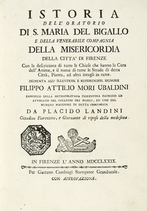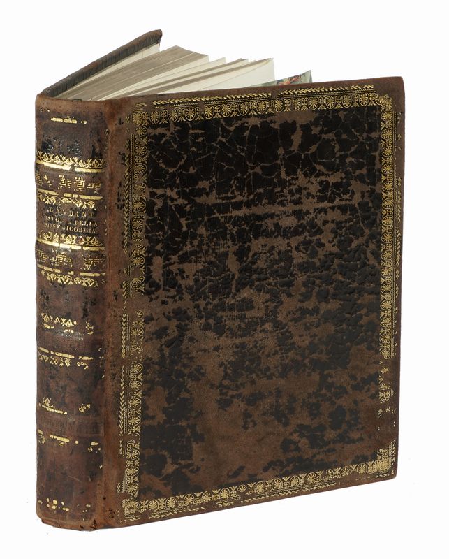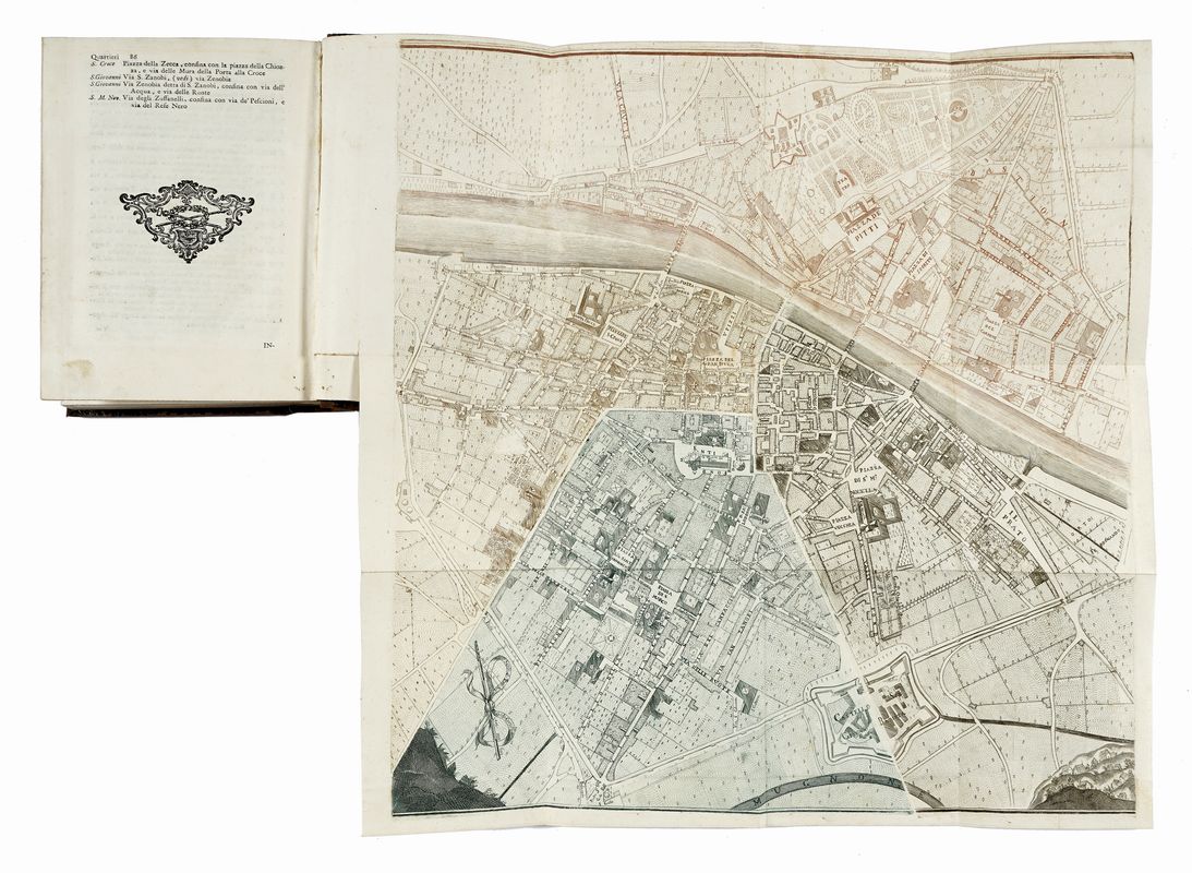 In-4° (mm 238x174). Pagine [2], LXXXVIII, 50, [100], 51-88. Con, nel complesso, 52 tavole calcografiche a colori, di cui 5 carte più volte ripiegate raffiguranti i vari quartieri di Firenze e l'ultima, legata in fine, che raccoglie le prime quattro carte su un unico foglio. Esemplare splendidamente conservato e ben impresso su carta forte. Legatura successiva in piena pelle con cornici di filetti a fregio fitomorfo impressi in oro ai piatti e titolo e decorazioni dorate ai comparti del dorso. Mancanze lungo le cerniere e i piatti, legatura lisa. Ex-libris di precedente collezione al contropiatto anteriore, timbro di precedente collezione al frontespizio.