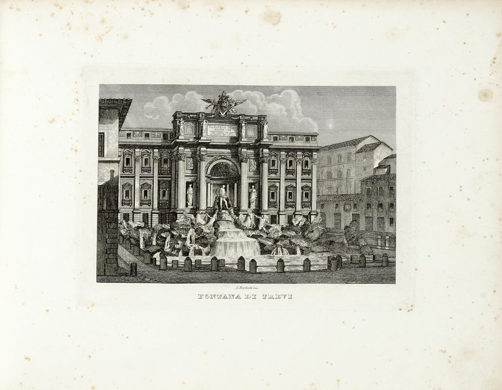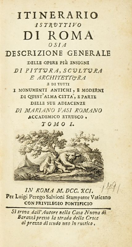 2 parti in 1 volume in-8° (mm 162x90). Pagine XII, 366 con 8 tavole fuori testo, di cui 2 ripiegate; [2], 369-828 con 7 tavole a piena pagina fuori testo. Copia con occasionali macchie, alcune carte allentate e altri minori difetti conservativi. Legatura successiva in mezza pelle con piatti in carta marmorizzata e titoli in oro al dorso. Ex-libris di precedente proprietario in principio di volume. SI AGGIUNGE: Raccolta delle principali vedute di Roma e suoi contorni. In Roma: presso l'Editore Gia. Antonelli, s.d. In-4° oblungo (mm 193x245). Comprende 1 frontespizio inciso e 50 tavole raffiguranti di vedute della Capitale e sue vicinanze. Restauro marginale al verso del frontespizio. copia con fioriture diffuse a gran parte delle tavole. Legatura coeva in pieno marocchino verde con cornici di filetti impressi in oro e a secco ai piatti, decorazioni dorate ai comparti del dorso e titolo impresso in oro al centro di ciascun piatto. Legatura parzialmente staccata, con mancanze lungo le cerniere. Piatto posteriore staccato.