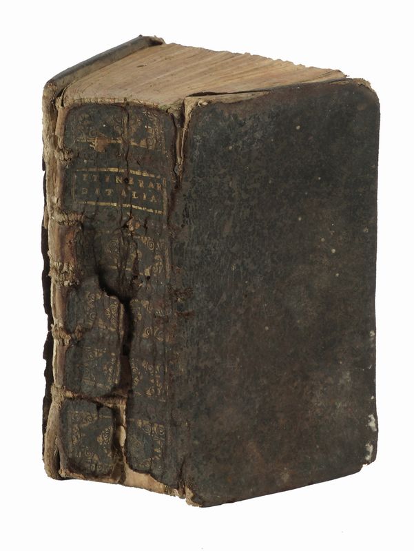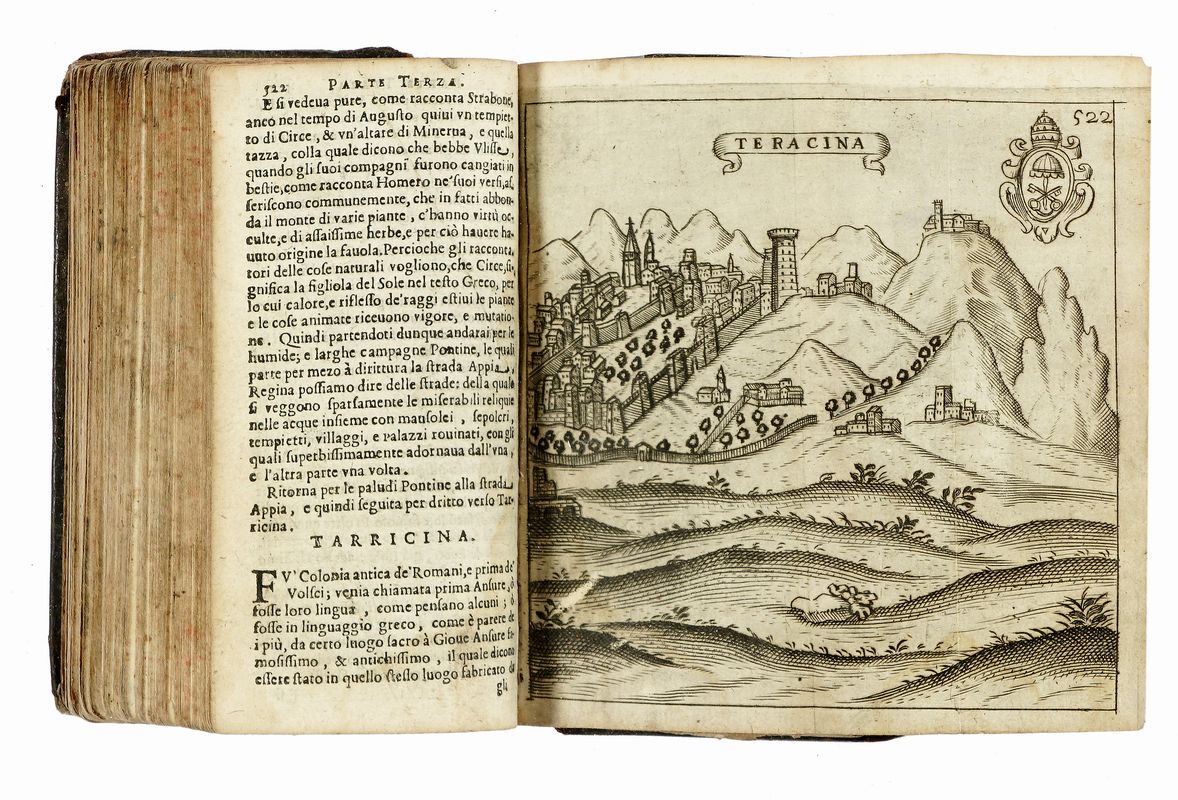 3 parti in 1 volume in-12° (mm 133x75). Pagine [24], 706 [i.e. 704], 2 bianche con 35 [di 37] tavole ripiegate fuori testo, ciascuna raffigurante una diversa città italiana. Ciascuna parte con proprio frontespizio con incisione in legno. Copia con difetti; assente la carta di testo G11, piccoli lavori di tarlo marginale nella prima parte del volume, più consistenti nel margine interno della terza parte (talvolta con perdita di alcune lettere di testo e piccole porzioni di inciso), occasionali macchie e gore. Legatura coeva in piena pelle con titolo impresso in oro al dorso. Mancanze lungo cerniere e dorso.