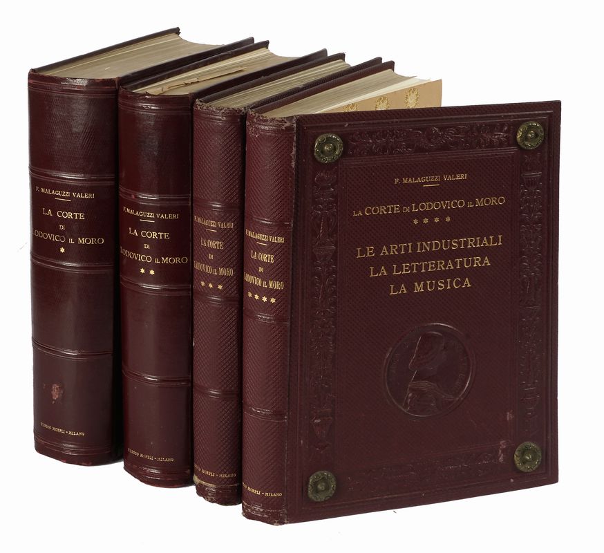 4 volumi in-4° grande (mm 298x205). Con numerosissime incisioni nel testo e fuori testo corredate di velina protettiva. Ottima copia. Bella legatura editoriale in tela rossa con decorazioni in oro e a secco ai piatti e borchie metalliche agli angoli di ciascun piatto. Tagli dorati, sguardie in carta decorata. Minime mancanze lungo le cerniere, per il resto stato conservativo perfetto.