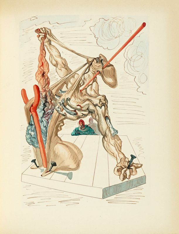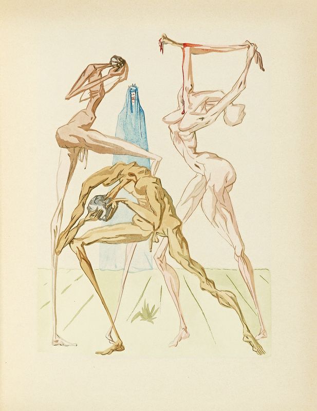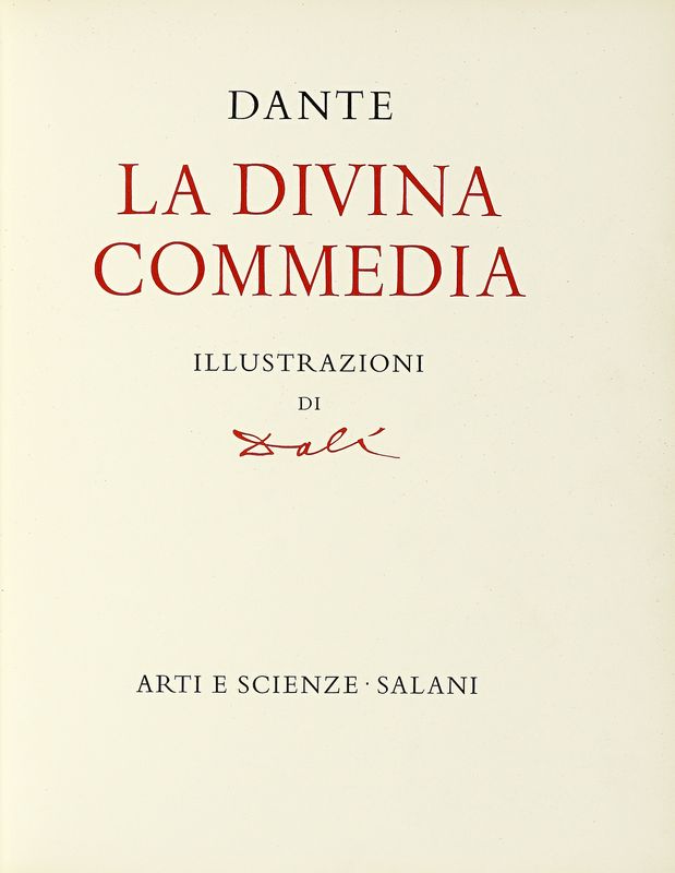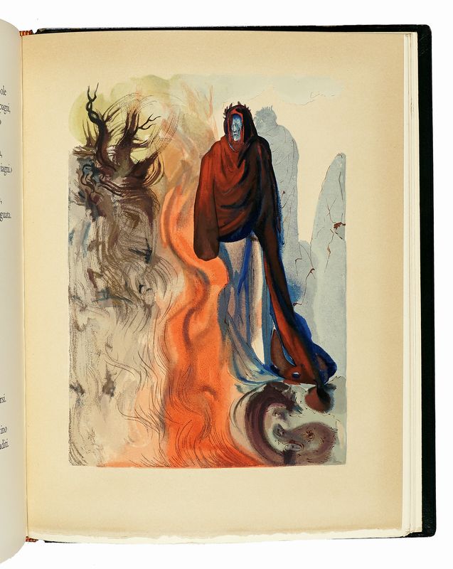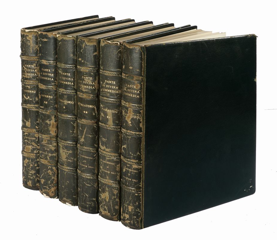 6 volumi in-folio (mm 332x253). Pagine [2], 2 bianche, 158, [2], [2] bianche con 17 tavole a colori fuori testo numerate 1-17; [12], 173-326, [8] con 17 tavole a colori fuori testo numerate 18-34; [2], 2 bianche, 162, [2], [2] bianche con 17 tavole a colori fuori testo numerate 1-17; [12], 173-328, [4], [2] bianche con 16 tavole a colori fuori testo numerate 18-33; [2], [2] bianche, 163, [1 ], [2] bianche con 17 tavole a colori fuori testo numerate 1-17; [2], [2] bianche, [8], 173-320, [4], [2] bianche con 16 tavole a colori fuori testo numerate 18-33. Lievi bruniture uniformi ad alcune tavole, altrimenti buona copia parzialmente in barbe; stampata in nero, con testo a due colori: rosso per i due tomi dell'Inferno, viola per il Purgatorio e blu per il Paradiso. Legatura coeva in piena pelle, con titoli in oro al dorso a 5 nervi, taglio superiore dorato e sguardie in seta verde. Spellature al dorso, rare ai piatti, e difetti alle cerniere. Uno dei 2900 esemplari impressi dalla Stamperia Valdonega su carta a mano dei Fratelli Magnani di Pescia, su una tiratura complessiva di 3044 copie.