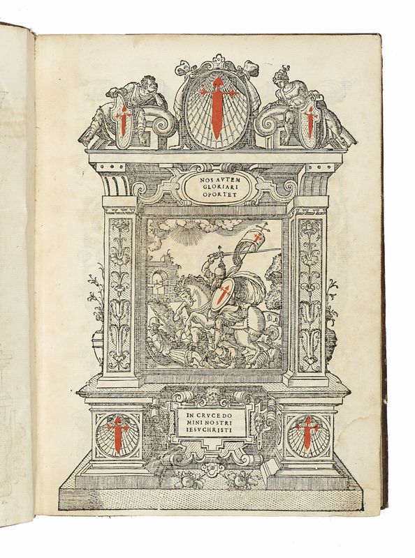 In folio (mm 277x196). Carte [14], 156 con 2 tavole a piena pagina fuori testo. Frontespizio inciso. Prima carta rimontata con pecetta, una gora d'acqua nel margine esterno della seconda metà dei fascicoli, per il resto buona copia, completa. Legatura in pelle con cornici concentriche impresse in oro e a secco ai piatti e armi impresse in nero e rosso al centro di ciascun piatto, in ognuna dicitura *CO* *SAR* con ritocchi a mano. Decorazioni in oro ai comparti del dorso, tagli dorati e goffrati. Lavori di tarlo a piatti e dorso. Ex-libris di precedente proprietario al contropiatto anteriore. Note di possesso di mani diverse alle carte di guardia anteriori.