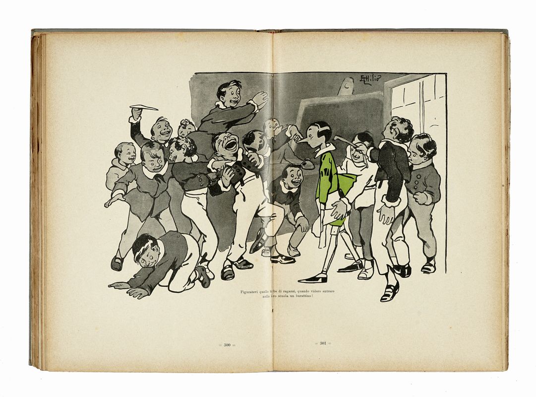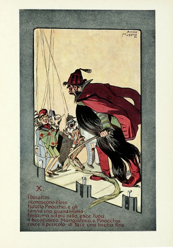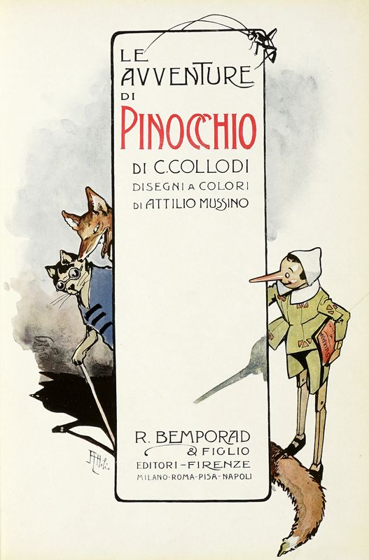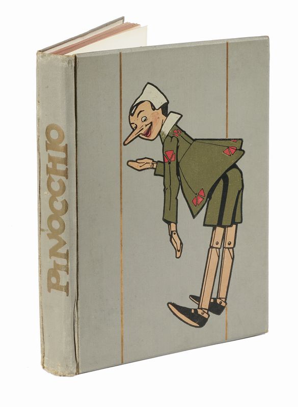 In-4° (mm 300x200). Con il ritratto dell'Autore in antiporta e molte, belle, illustrazioni in bianco e nero e a colori, anche a piena pagina, nel testo e fuori testo. Strappetti e mancanze al margine interno dell'occhietto e della carta di prefazione. Lievi fioriture sparse e qualche strappetto marginale maldestramente restaurato alla tavola di apertura del capitolo XVII. Legatura editoriale in piena tela grigia, con un'illustrazione di Pinocchio in abito verde al piatto anteriore; titoli in oro al dorso e taglio superiore rosso. Una macchia sul volto di Pinocchio e cuffie stanche. Annotazione manoscritta all'occhietto.