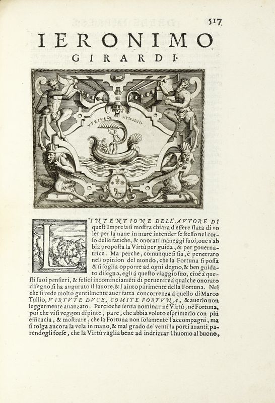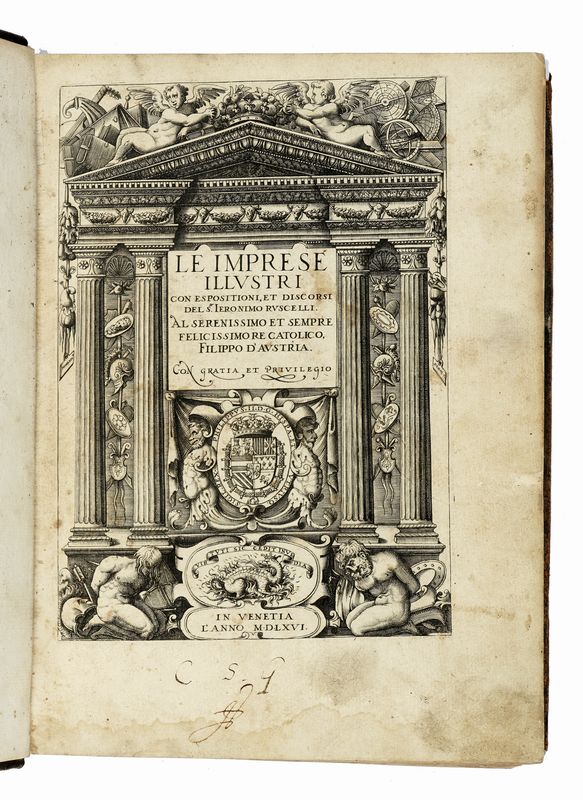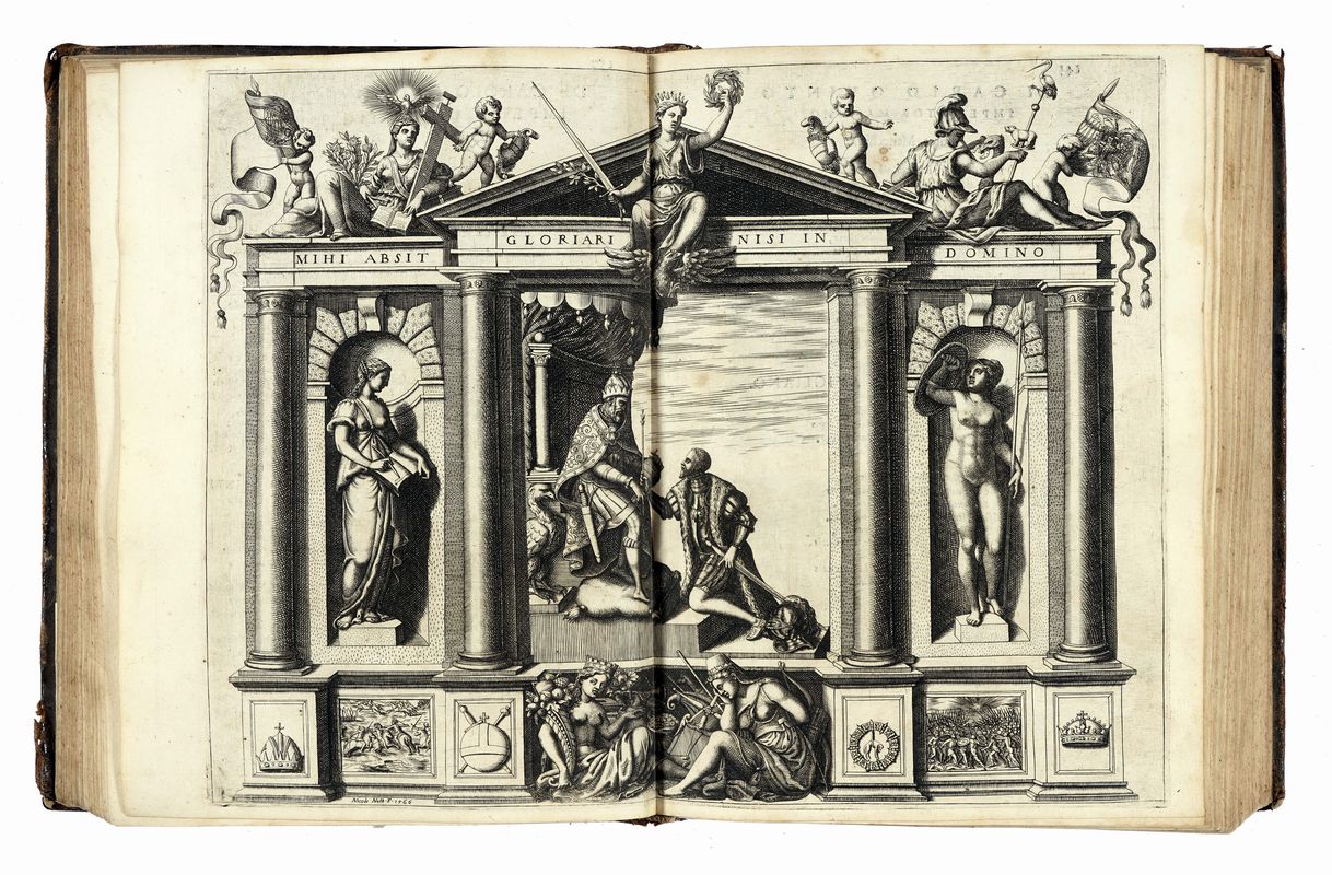 3 parti in 1 volume in-4° (mm 263x193). Pagine [20], colonne 1-8, pagine 136, colonne 137-144, pagine 344, colonne 345-352, pagine [4], 353-398, [18], 401-566, [2] con 2 tavole a doppia pagina fuori testo. Ciascuna parte con proprio frontespizio inciso, 5 tavole a doppia pagina (di cui 3 nel testo e 2 fuori testo), moltissime calcografie con emblemi impresse a mezza e piena pagina nel testo, inclusi emblemi di re, regine e imperatori. Copia con tracce d'uso al frontespizio, leggere gore d'acqua marginali alle prime e alle ultime carte, sporadiche fioriture, lievemente rifilata nel margine superiore, ma per il resto completa, internamente in ottimo stato e marginosa. Legatura successiva in piena pelle con titolo impresso in oro su tassello al dorso e decorazioni dorate ai comparti. Mancanze lungo cerniere e dorso, unghiature lise.