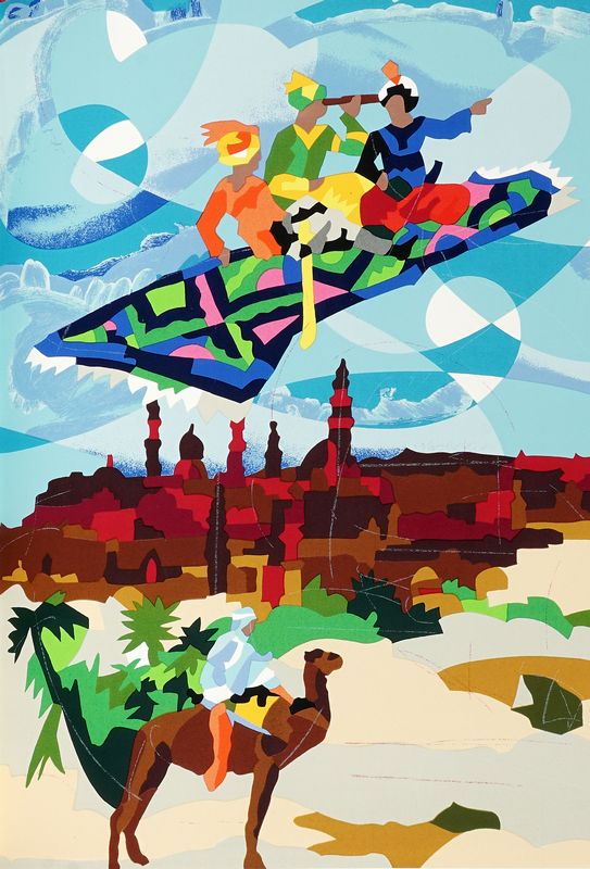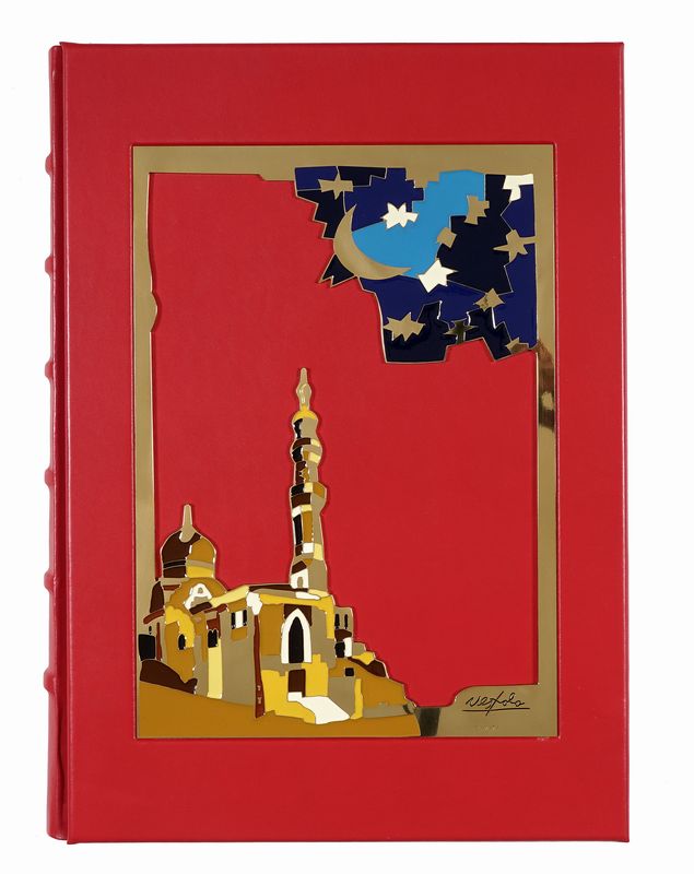 In-folio (mm 450x325). Splendido esemplare in barbe, con 10 tavole litoserigrafiche di Ugo Nespolo. Legatura in pelle rossa con titoli in oro a 6 nervi e un esemplare dell'opera Sogno d'Oriente dell'Artista, in otto colori a smalto su lastra di ottone trattata a specchio, ricoperta in oro 24 k mediante procedimento galvanico, numerata e firmata. Uno dei 975 esemplari in numeri arabi, su una tiratura complessiva di 1050, firmati a matita dall'Artista. SI AGGIUNGE: Libro dei sogni [...] interventi artistici di Ugo Nespolo. Milano: FMR - Art'è, 2006. In-4° (mm 299x230).
